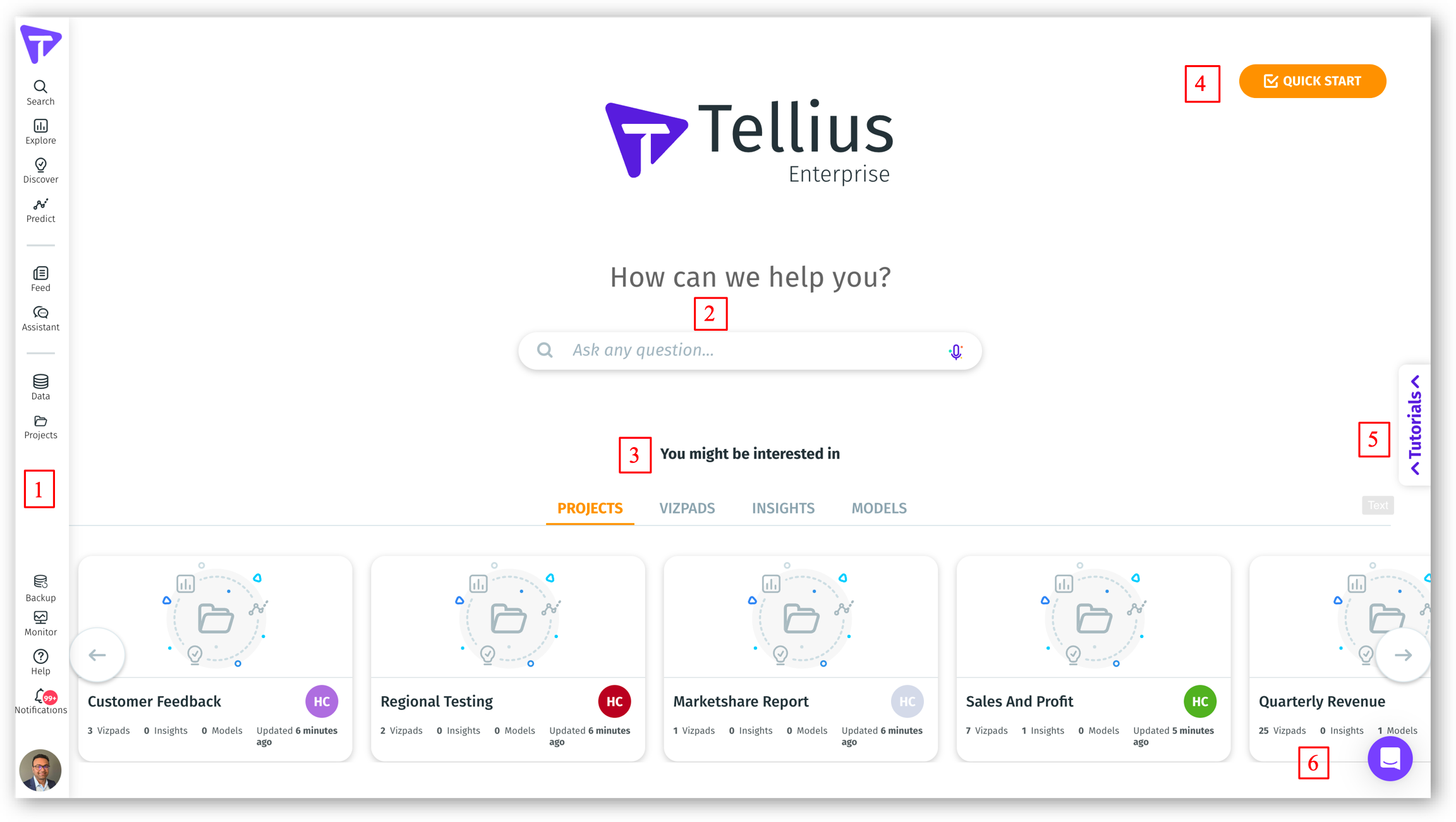 Tellius provides a user-friendly interface to make it easy for you to navigate around the platform. This page breaks down each component that you can see on the home page (the first page that greets you with when you log into Tellius).