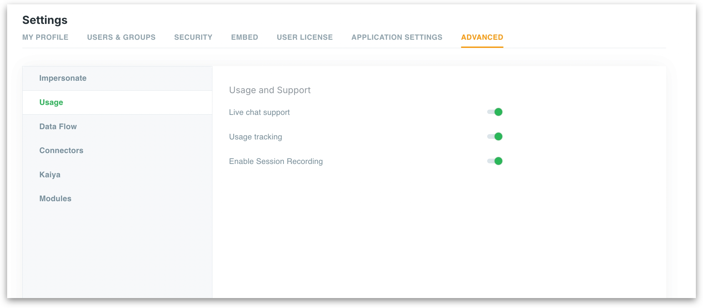 You can now manage session recordings directly from Settings → Advanced → Usage → Enable Session Recording. When enabled, all activities performed during your session will be automatically recorded, giving visibility into your usage activity.