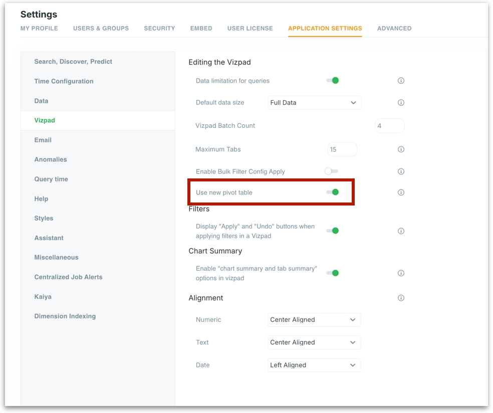 You can now turn on or off the new hierarchical pivot tables—with grouping and easy expand/collapse—under Settings → Application Settings → Vizpad → Use new pivot table toggle.