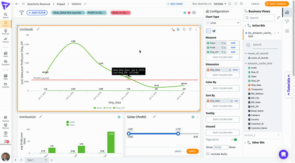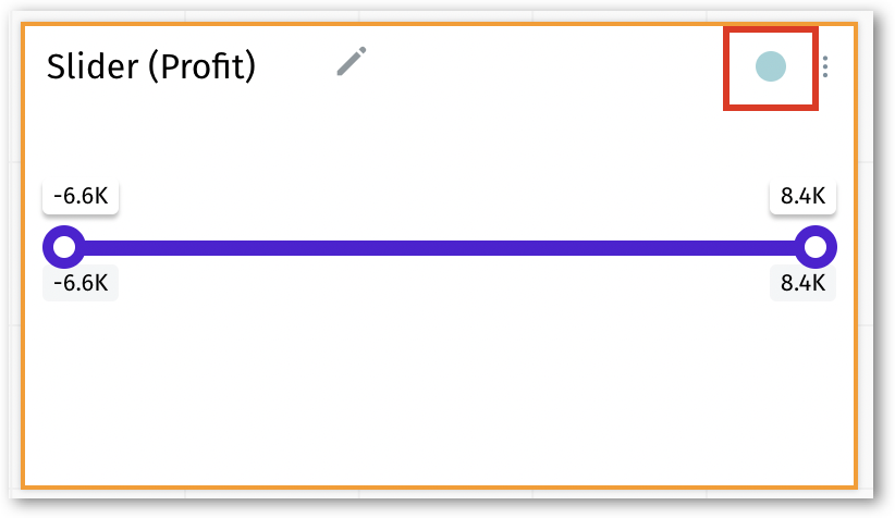 Axis and grid formatting The values displayed in the slider range control filters now inherit the formatting applied on the underlying Business View. For example, in the screenshot below, it inherits the suffix "K" for the numeric values. Also, the Business View names in the form of colored circles will be displayed in the top right corner.