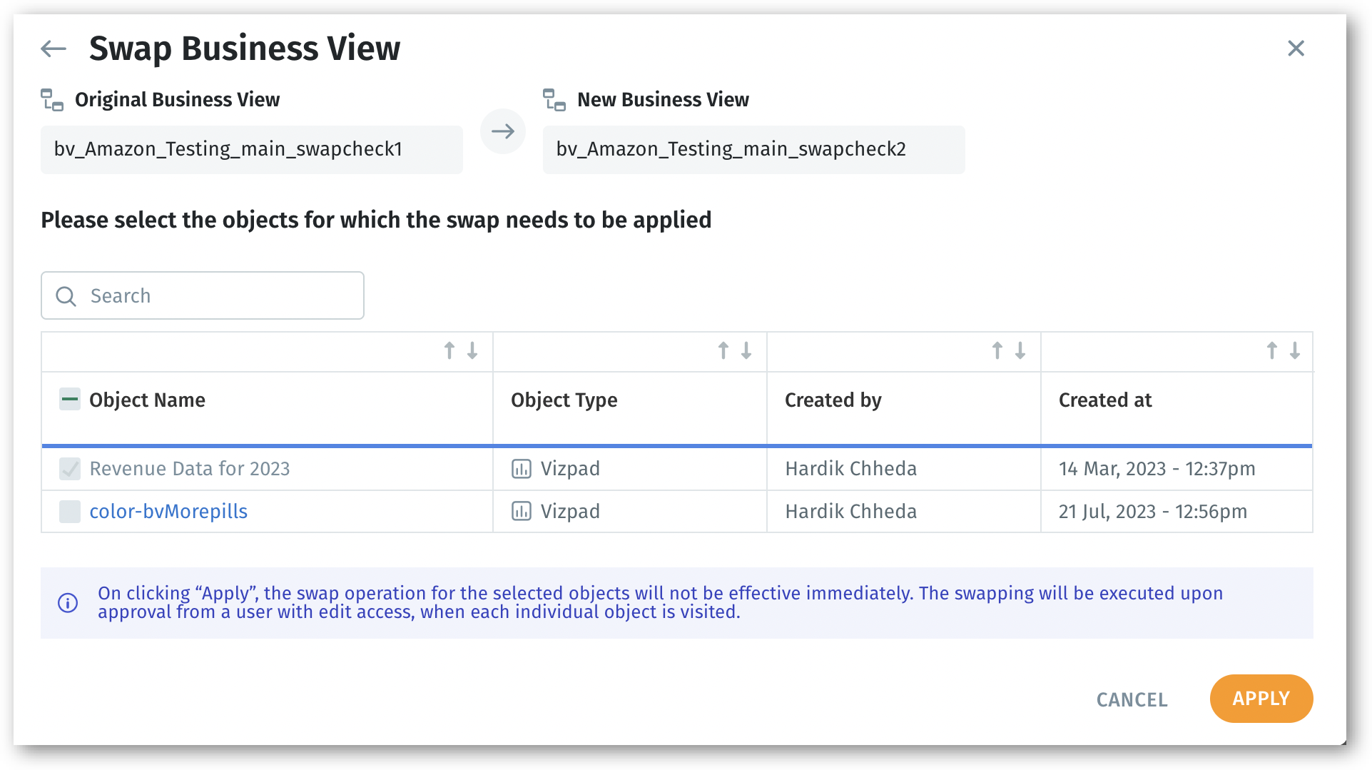 While swapping the underlying Business View of any object, users can simultaneously select multiple objects (Vizpads/Insights/Models) for which the Business Views need to be swapped. The swapping operation of the selected objects can be set up and will be effective once it is approved by a user with edit access.