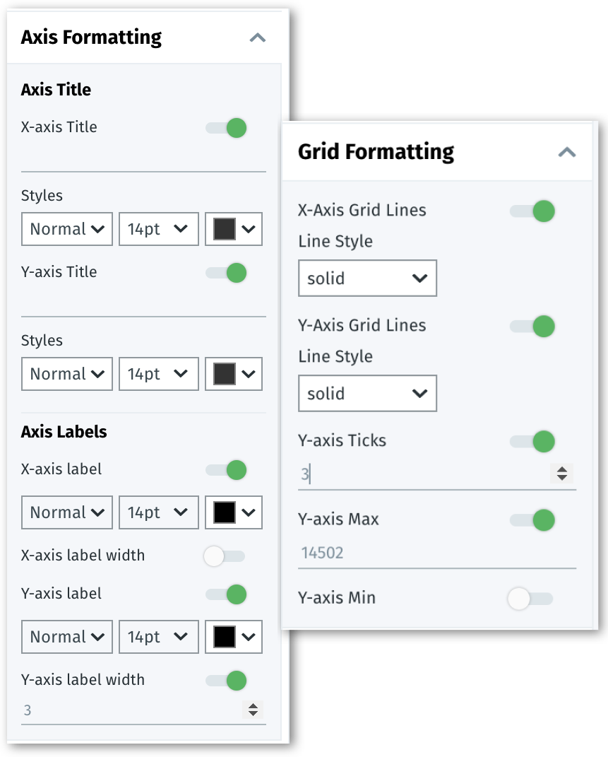 Axis formatting and grid formatting have been incorporated into bar conversion charts. Additionally, grid formatting has been extended to histogram and confidence range charts.