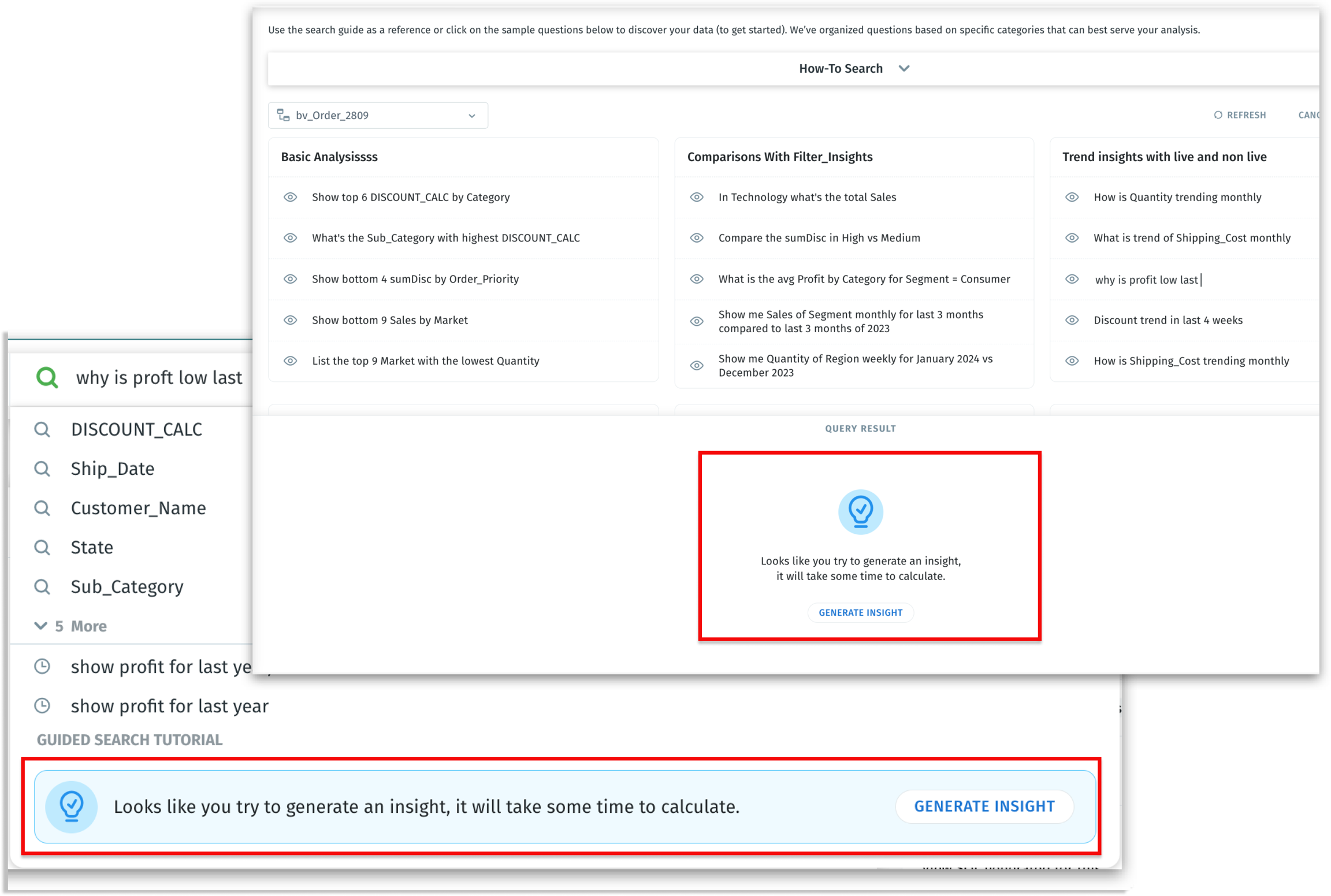 We've restored the ability to trigger Insights directly from Search. Tellius can smartly recognize user intent in various query formats, such as Trend Insight, Segment Discovery, and Cohort Insight, and configure them for relevant insights with prefilled parameters like target, time period, and filters.