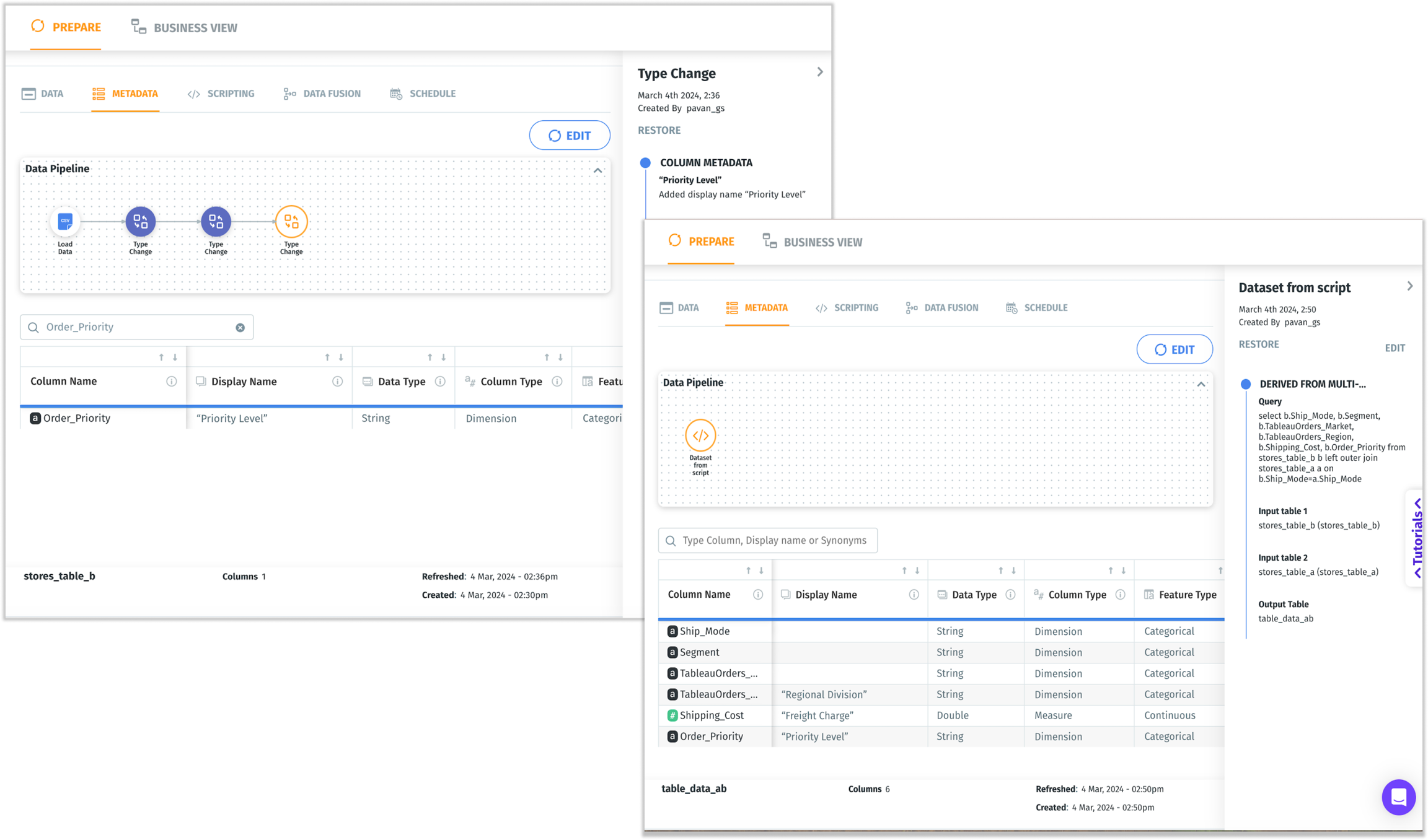 To enhance user efficiency, we've refined the process of creating scripted datasets. Previously, when a scripted dataset was generated, the associated metadata—such as display names, column descriptions, and synonyms—did not carry over, requiring manual re-entry. With this improvement, metadata from the source table will now be automatically mapped to the scripted dataset, provided column names have not been modified via aliases.