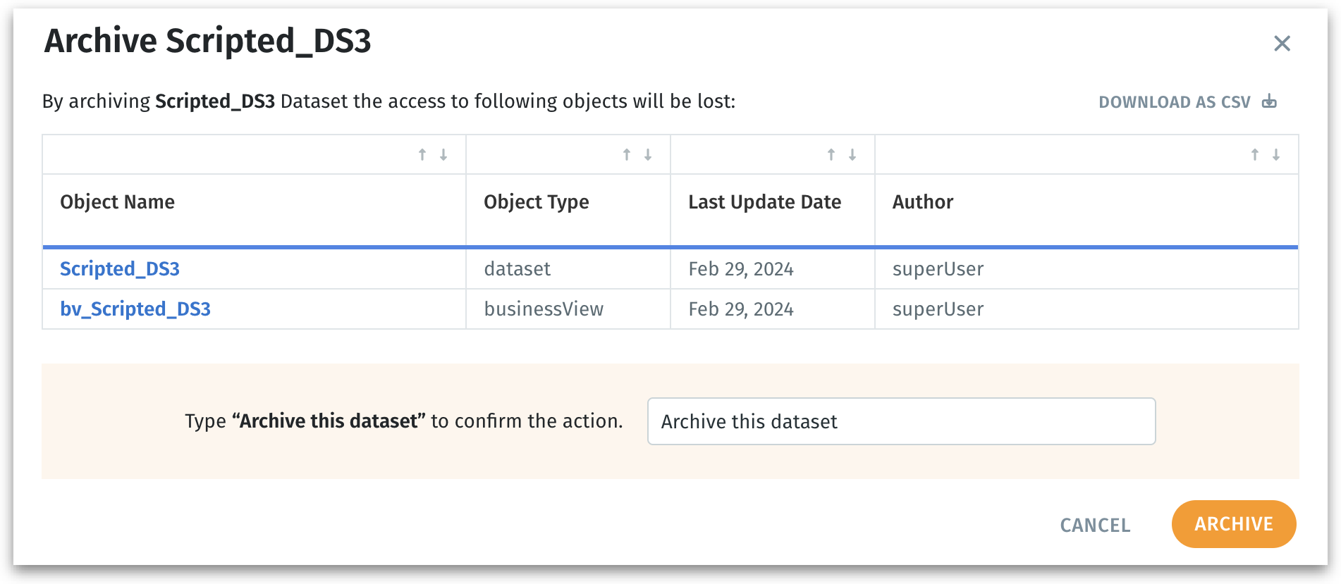 Users can now archive or unarchive datasets directly from the dataset list in the Data module. A warning message with a downloadable CSV file is displayed before archiving, detailing the impact on associated Business Views and objects. While a dataset is archived, only the options to delete and unarchive are available.