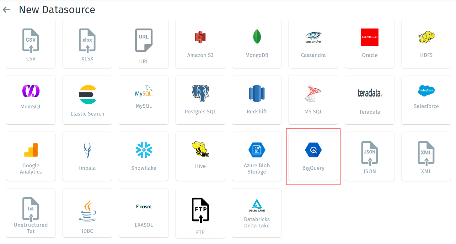 Guide to configuring Google BigQuery in Tellius, setting service accounts and permissions, and loading data from tables, views, external sources, and SQL queries.