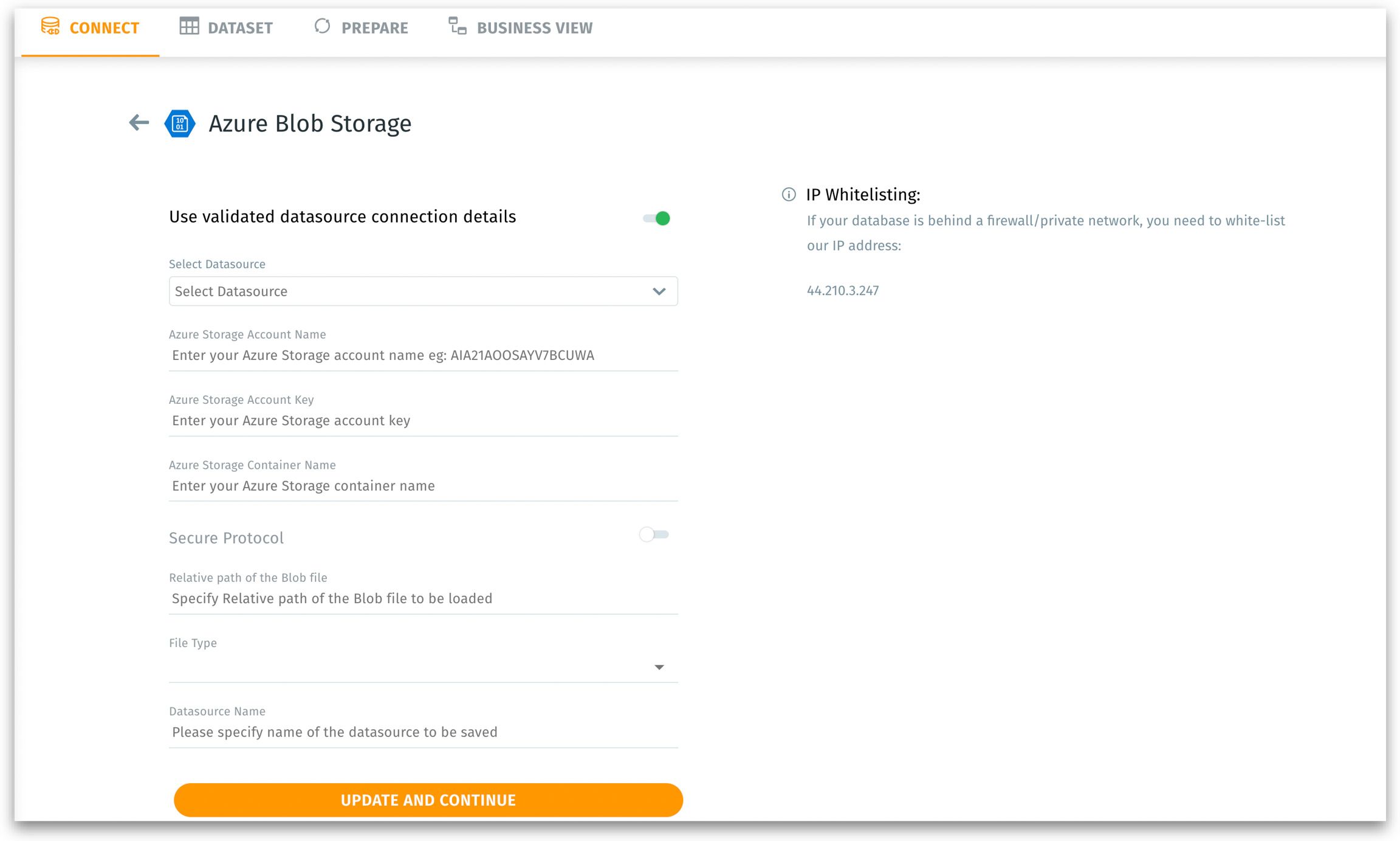 Select Datasource: A dropdown listing previously validated datasources of the same type (Azure Blob) so that if you’ve already configured an Azure Blob connection, you can reuse it.