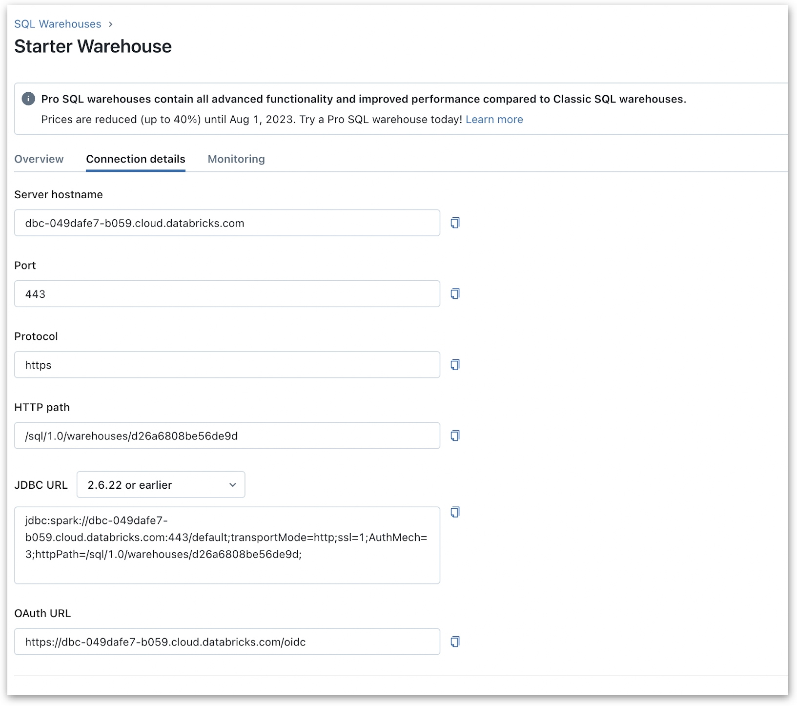 Copy the JDBC URL provided on the warehouse details page. The URL should be in the following format:
