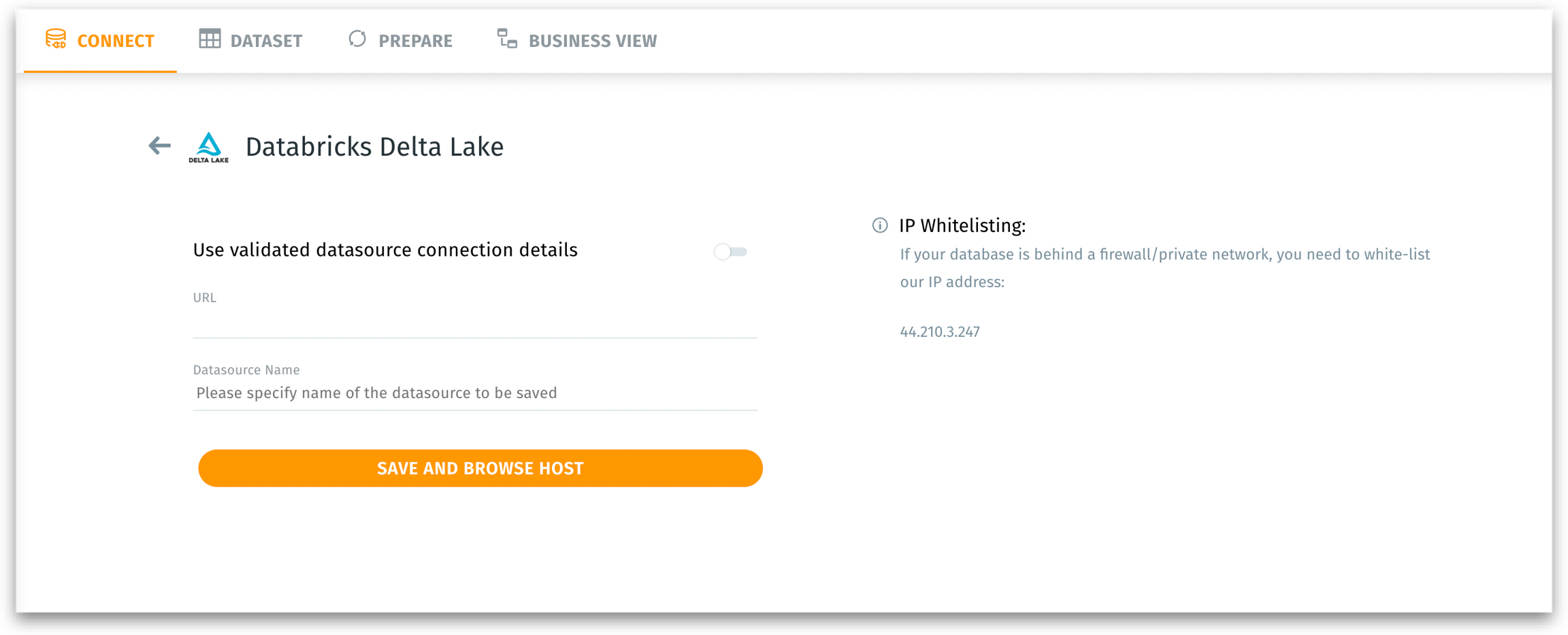 Use validated datasource connection details: When enabled, it reveals a dropdown to choose from existing, previously configured Delta Lake connections.