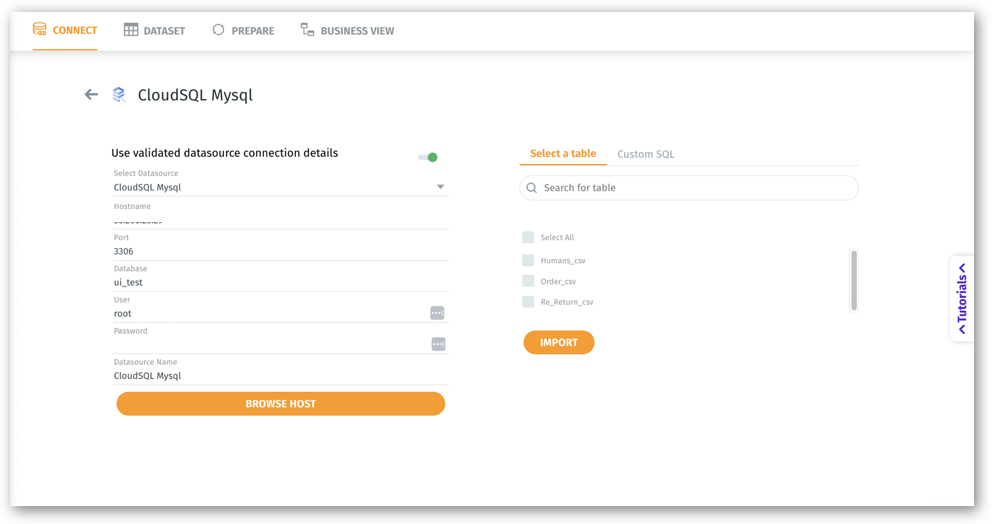 Click on Save and Browse Host (or Browse Host if you are using an already established connection). The list of tables from the data source will be displayed on the right side.