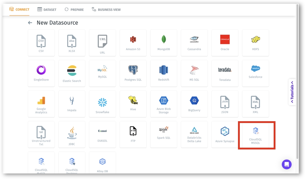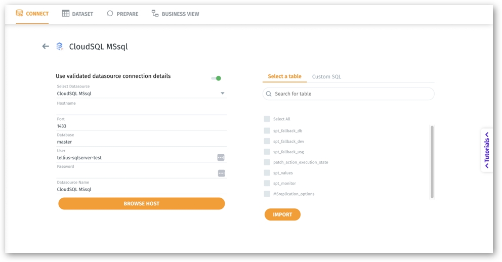 In the Tellius platform, navigate to Data → Connect → Create New → MSSQL.