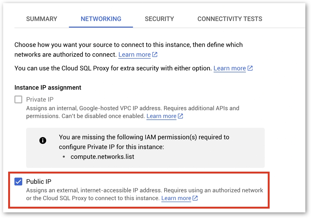 In the Primary Instance pane on the left side, select Connections and click on the Networking tab.