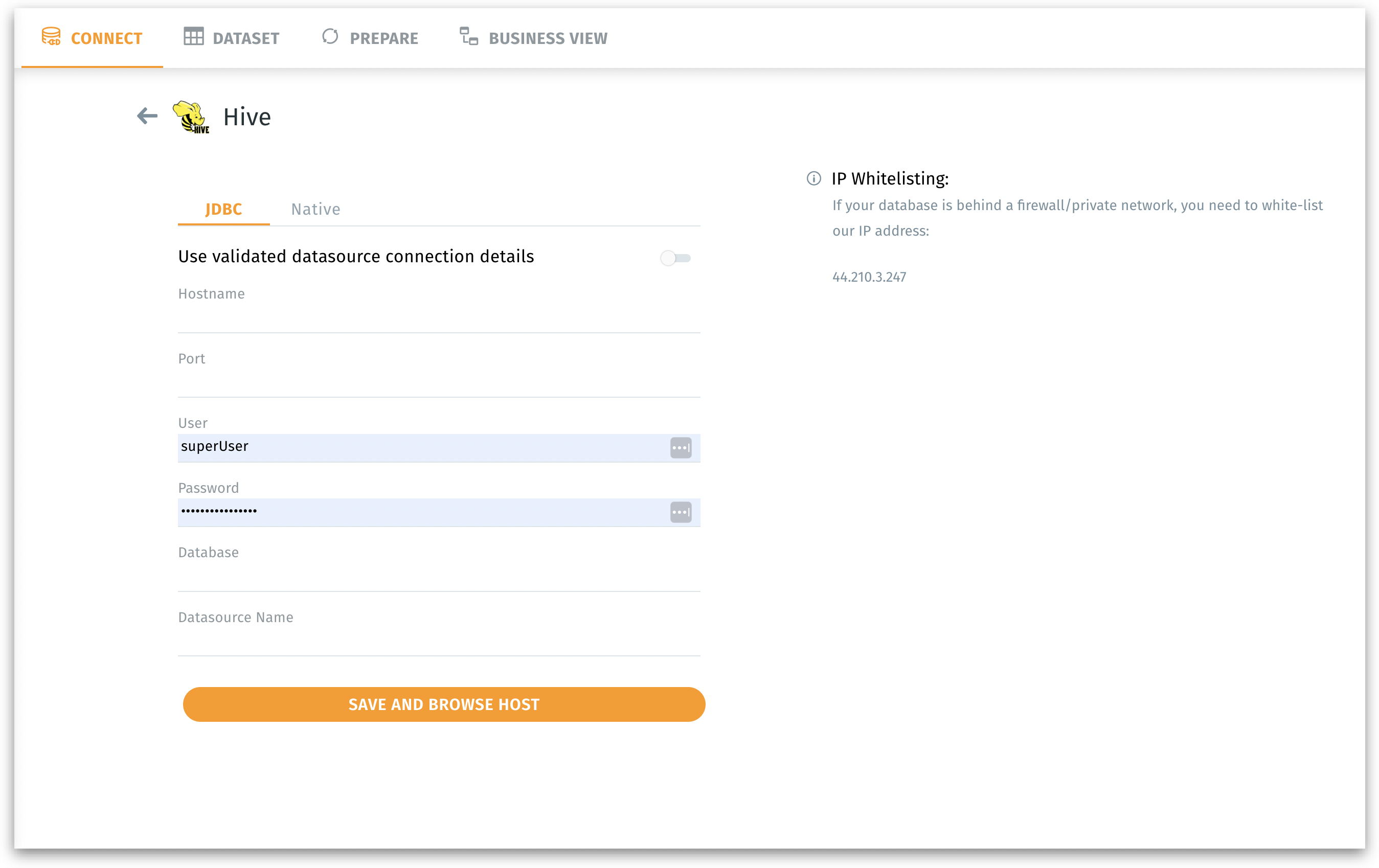 1. **Use validated datasource connection details:** When enabled, it reveals a dropdown to choose from existing, previously configured Hive connections.
