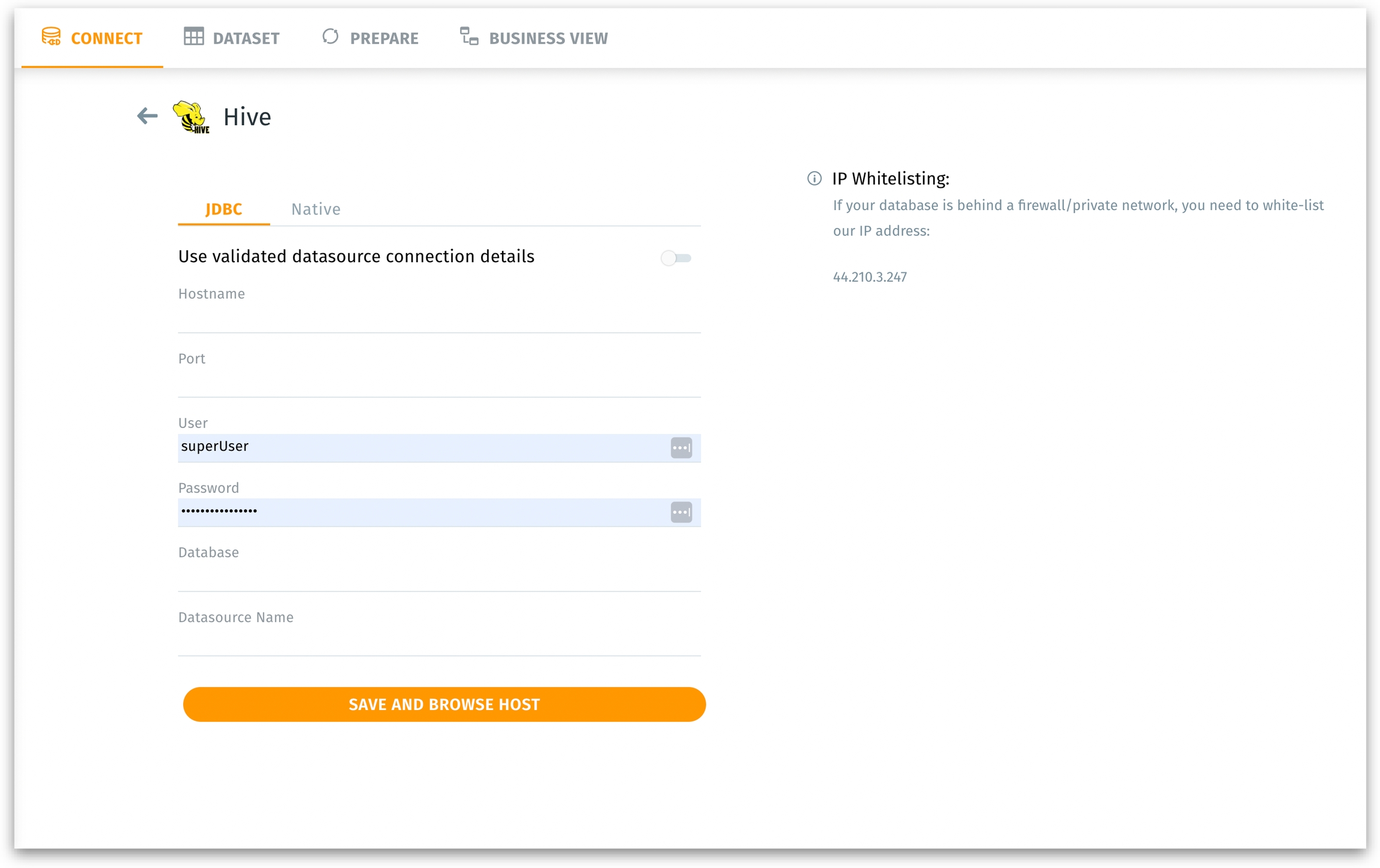 A direct JDBC-based connection usually requires specifying Hostname, Port, User, Password, Database, and a Datasource Name. This method leverages a standard JDBC driver for Hive, similar to how you would connect to other databases (e.g., MySQL, Postgres) via a host/port combination.