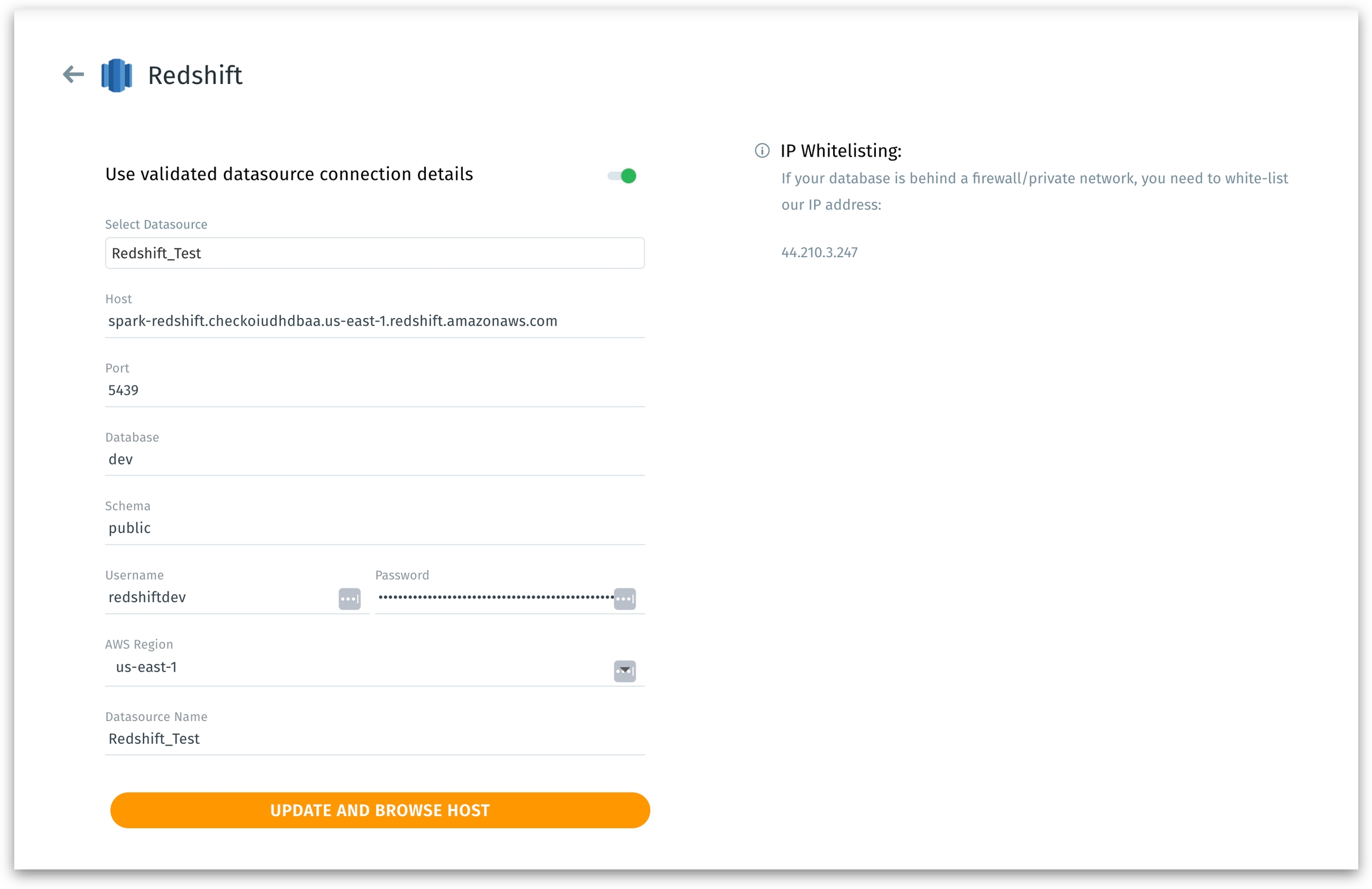 Use validated datasource connection details: When enabled, it reveals a dropdown to choose from existing, previously configured Redshift connections.