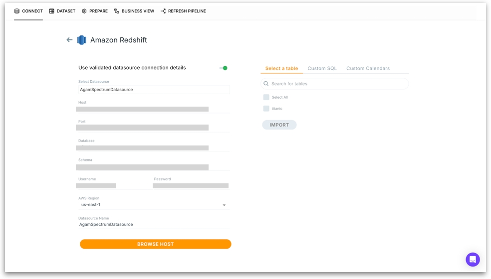 In Tellius, navigate to Data → Connect → Add new datasource → Amazon Redshift.