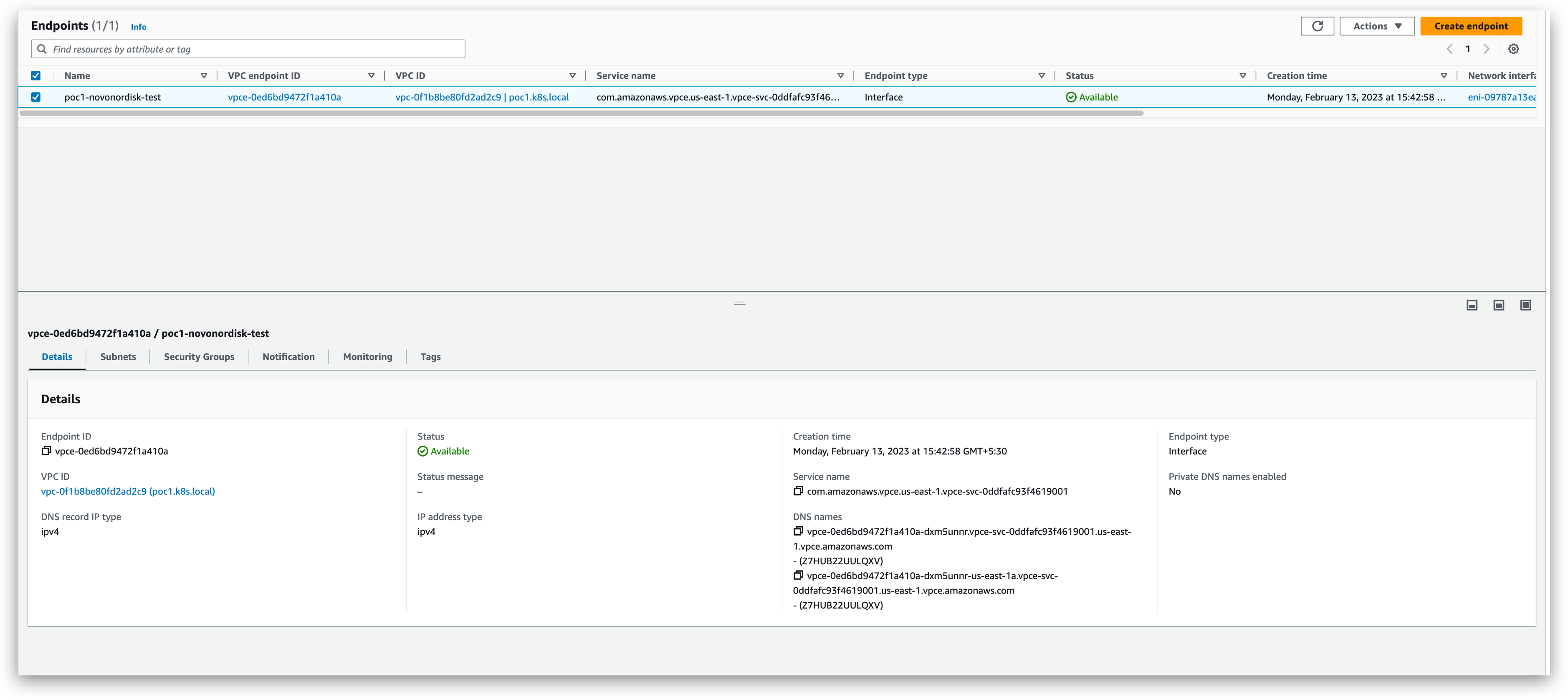 2. When creating the VPC endpoint, make sure to select the VPC and subnet where your Kubernetes cluster/instance is running, and also make sure to choose the appropriate security group that allows traffic from the Kubernetes cluster.