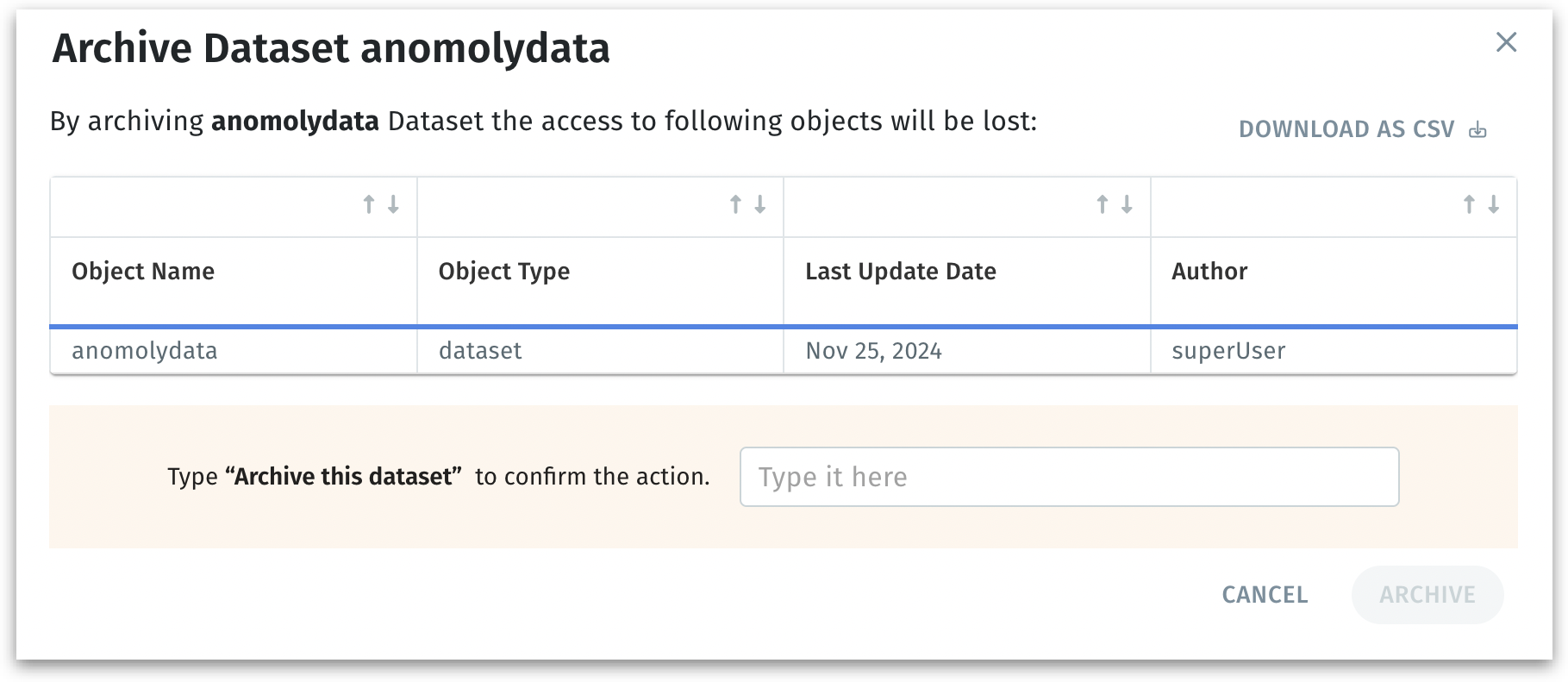 Before archiving, you can also Download the list of impacted objects as a CSV file.