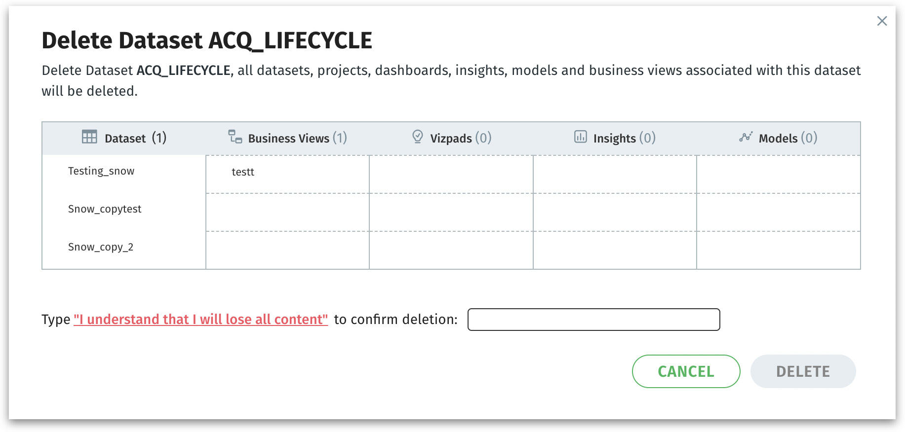 Click on Delete to permanently remove the dataset and all listed objects (Business Views, Insights, etc.) or click on Cancel to discard. Once deleted, this action is irreversible.