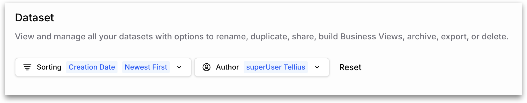 Select dataset author(s): Superusers can filter data assets by who created them using the Author filter. This filter is available across the Dataset, Prepare, and Business View tabs within the Data module. When you click the Author dropdown, it displays a list of all users who have created assets in that tab. Select one or more authors to filter the list to only show assets created by those users. Click Reset to clear the filter and return to the full list.