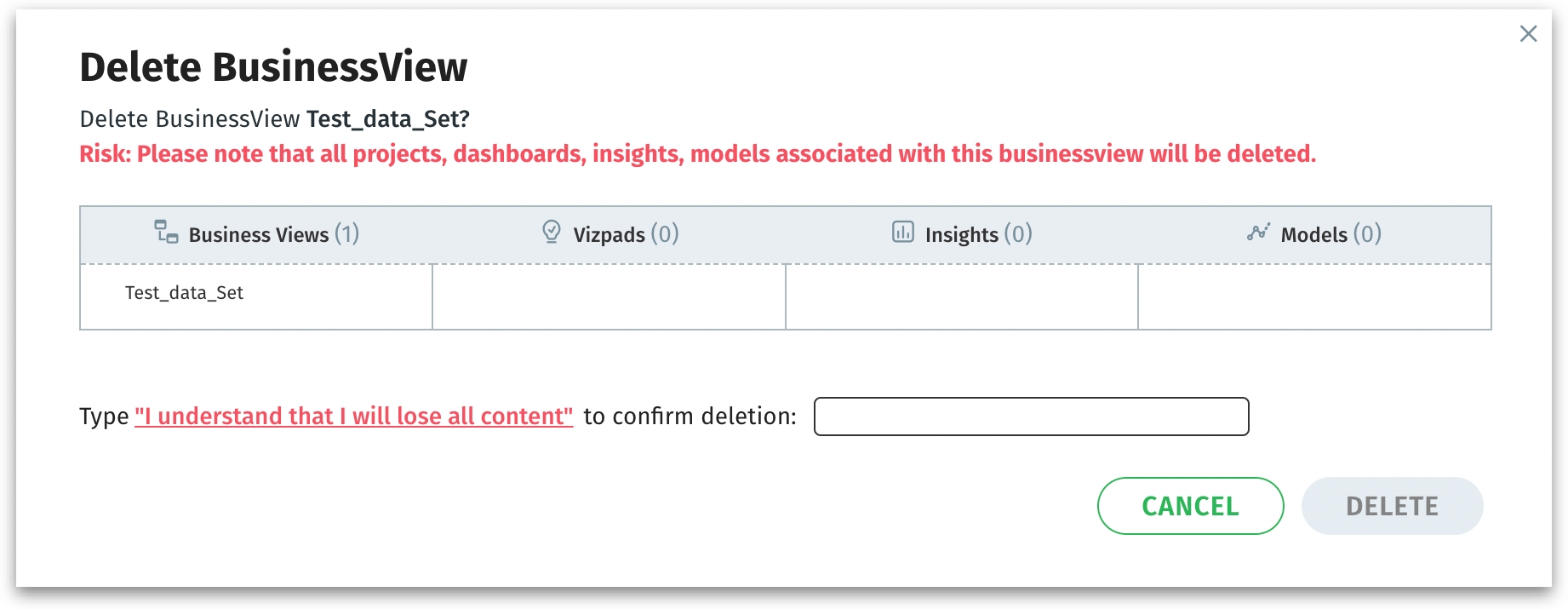 Click on Delete to permanently remove the Business View and all listed objects (Business Views, Insights, etc.) or click on Cancel to discard. Once deleted, this action is irreversible.