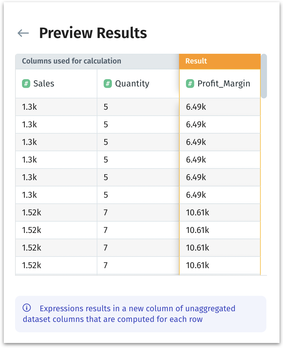 Results appear as a new unaggregated column, meaning each row has its own calculated value.
