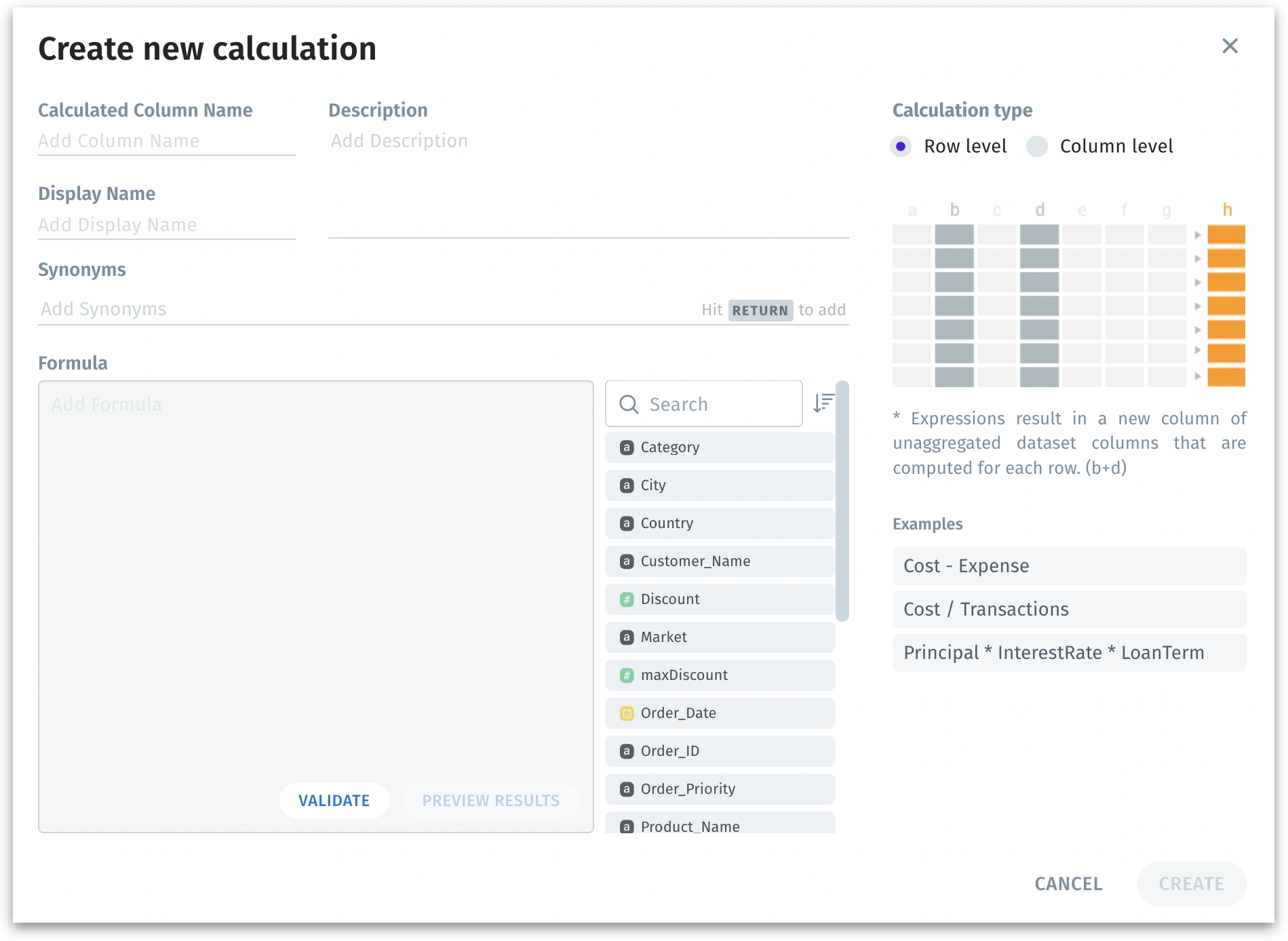 Create custom row-level or aggregated calculated columns in Tellius to extend datasets with business metrics, KPIs, and reusable formulas—all without altering source data.