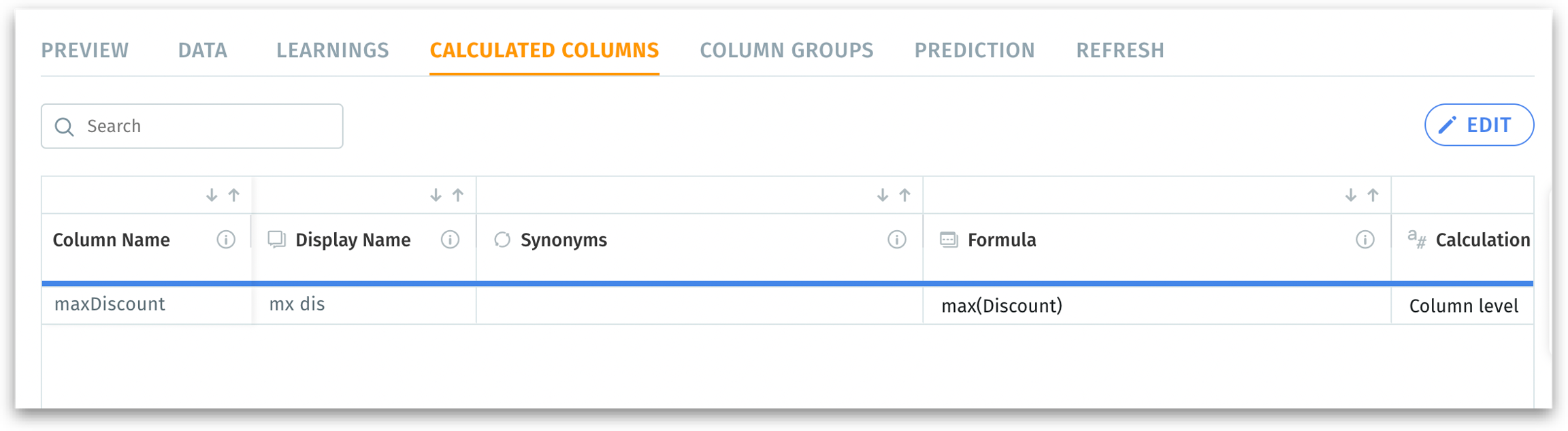 You can search for the required calculated column and each column displayed in the table can be sorted in ascending or descending order. In Edit mode, you will get Undo and Redo buttons left to the search bar for reverting or reapplying changes made to the calculated columns, ensuring flexibility and control over your edits. Each row in this table shows the following: