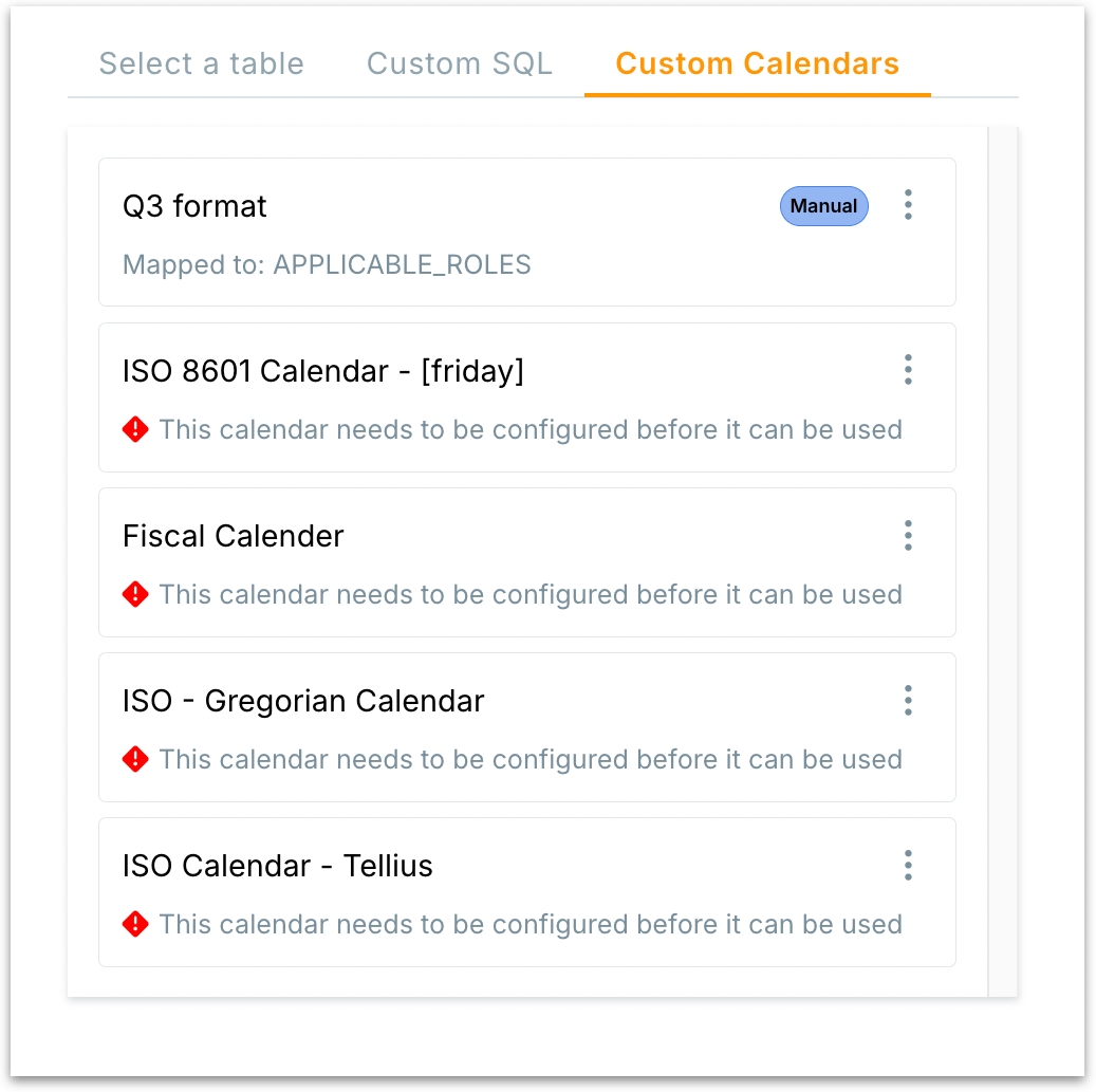 • If you map an existing calendar table, it will show up with a “Manual” tag, indicating it was linked manually to an existing dataset.