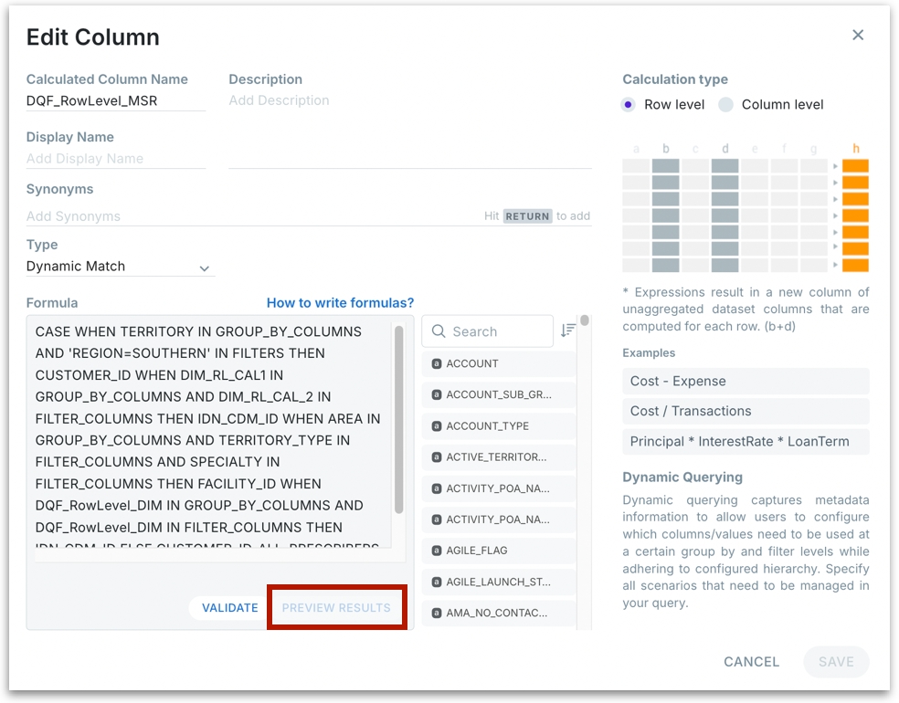 In the calculated column builder, the Preview option is disabled for dynamic match.