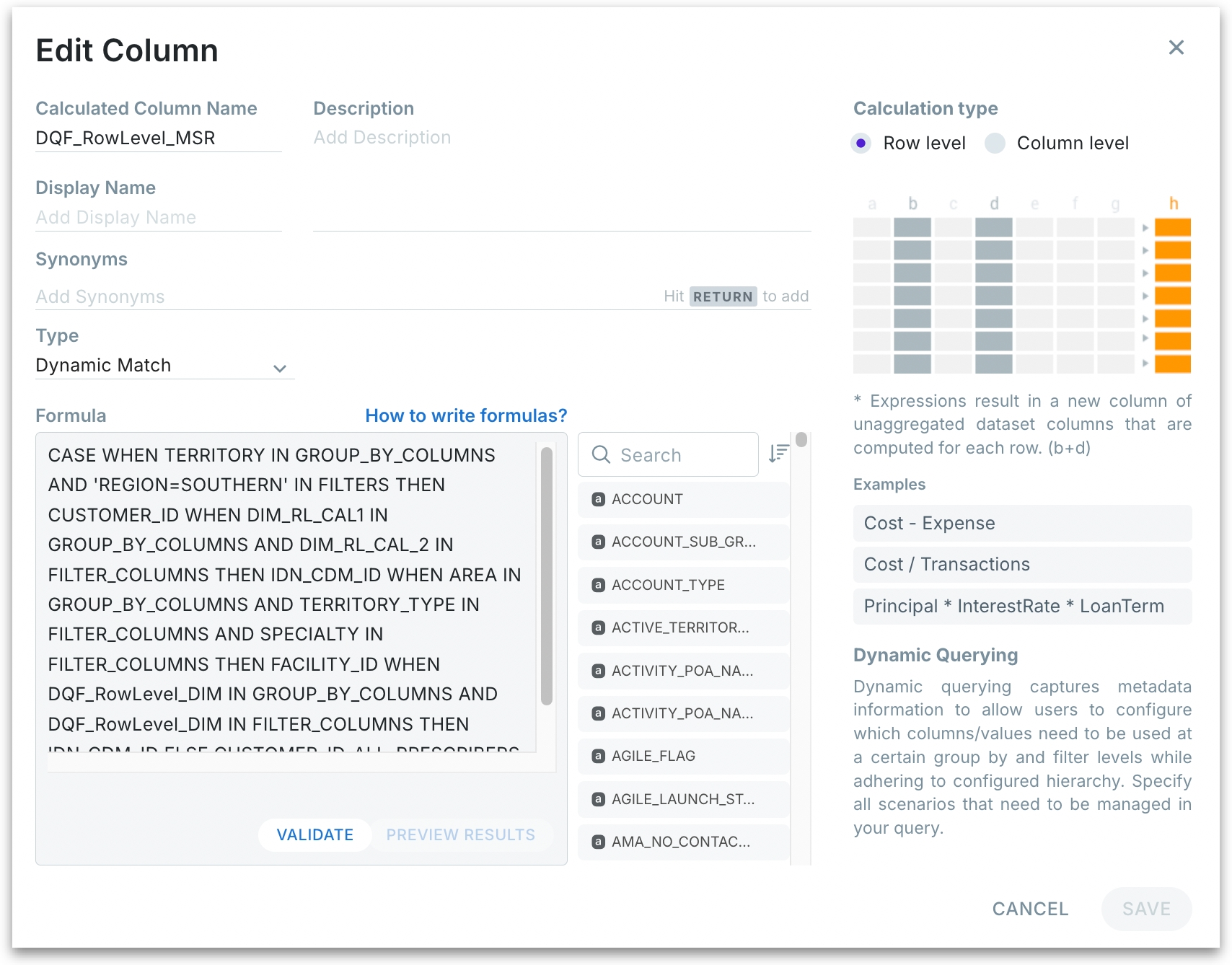 Row-level dynamic logic Applies the dynamic rule individually to each row in the dataset. This is ideal when your calculation needs to account for row-specific attributes, such as adjusting a score, price, or risk metric based on that row’s values and context.