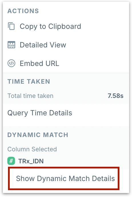 In any chart using a dynamic match, click the ⋮ three-dot menu on the chart. The following menu will be displayed and select "Show Dynamic Match Details".