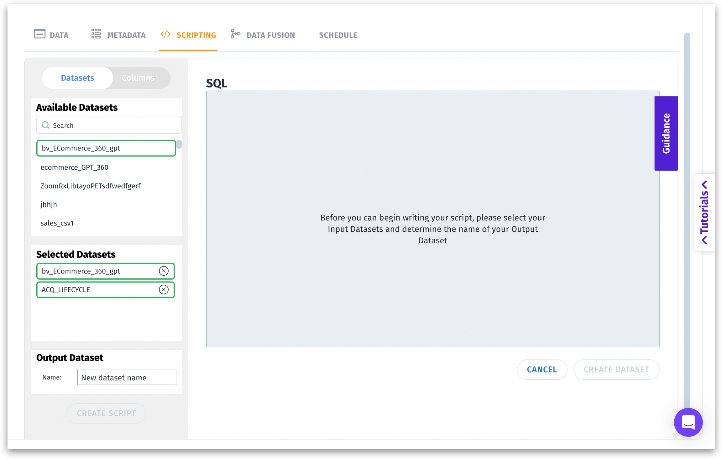 Selected Datasets: Shows which datasets you plan to work with in your script. Click the “X” to remove a dataset. You can select multiple datasets—unlike Data Fusion, which only allows two.