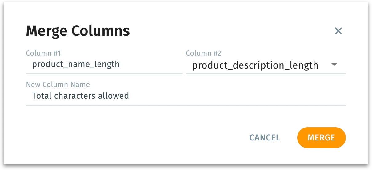 Merge column: Combine two columns into one—often used to concatenate strings (e.g., FirstName + LastName) or unify numeric fields. Here, you specify another column to merge and provide a name to the newly merged column.