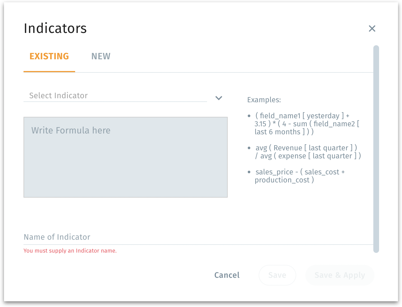 Save: Saves the Indicator in your library but does not immediately apply it to the dataset.