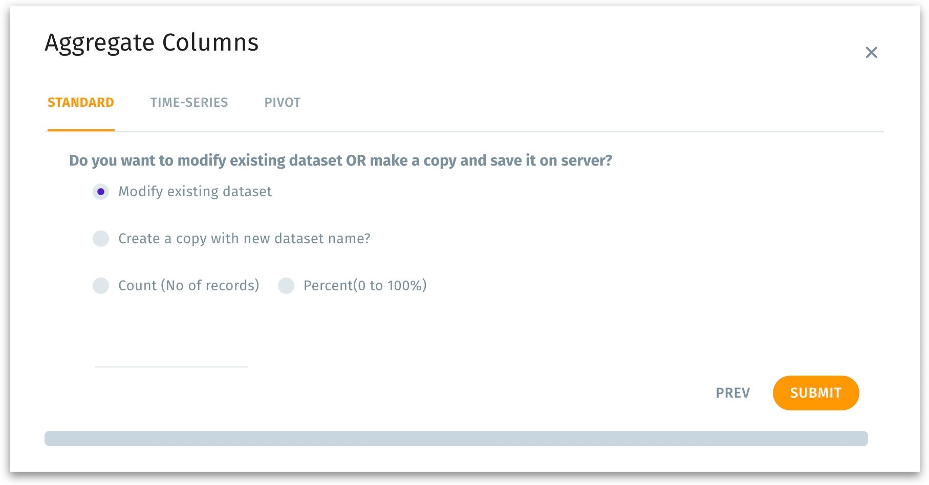 Modify existing dataset: Updates the current dataset directly with the new aggregated columns. Choose this option if you want to overwrite or enhance the existing dataset with the aggregation results.