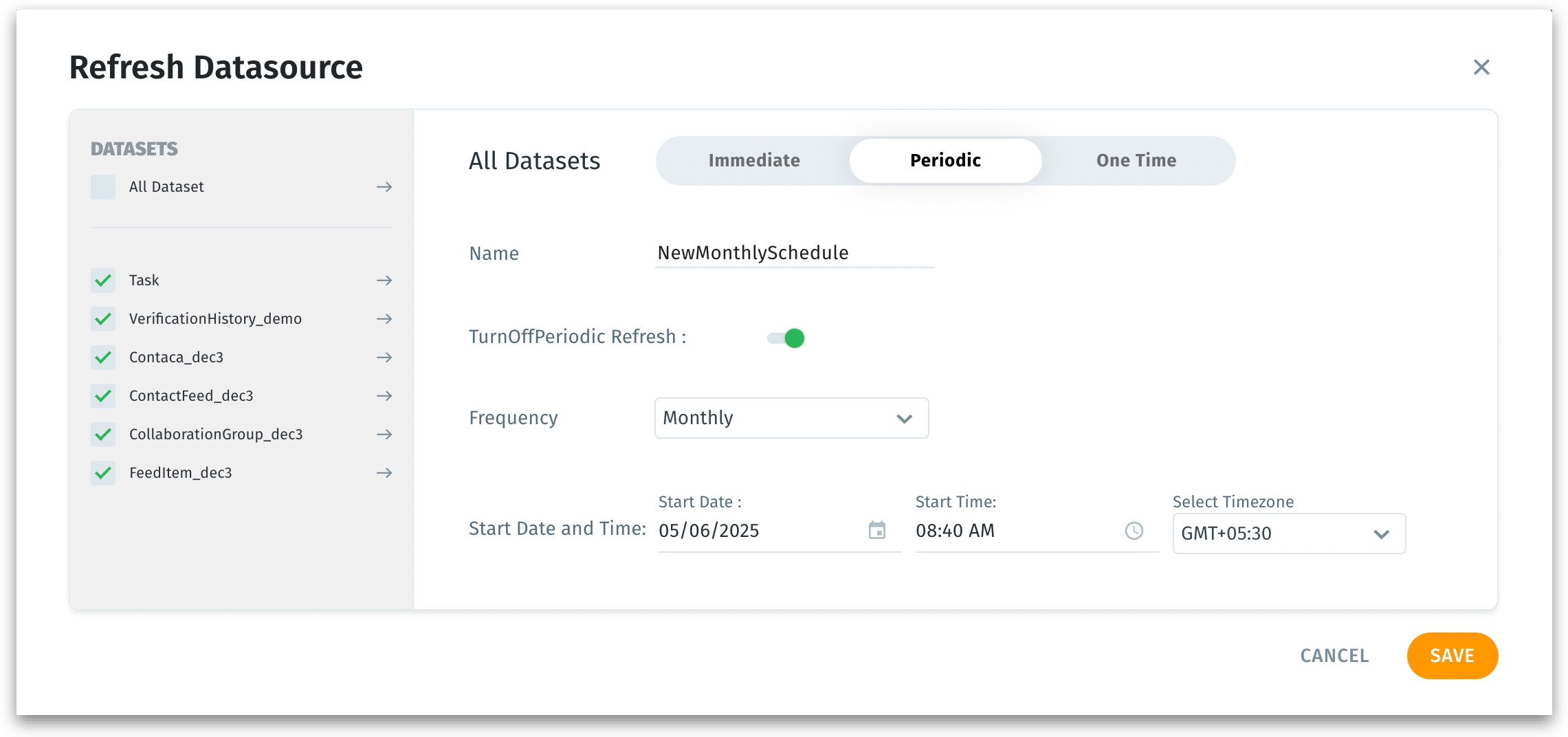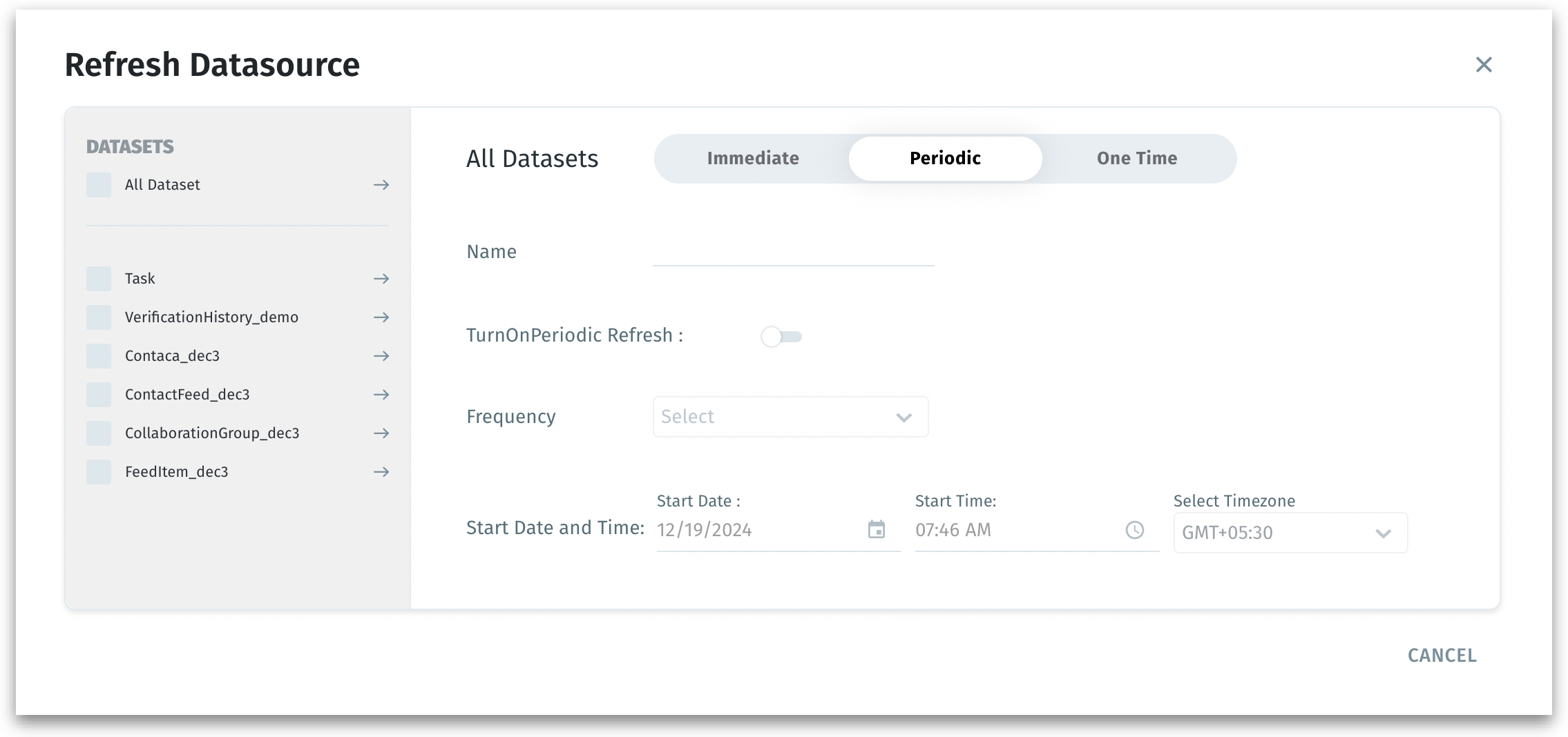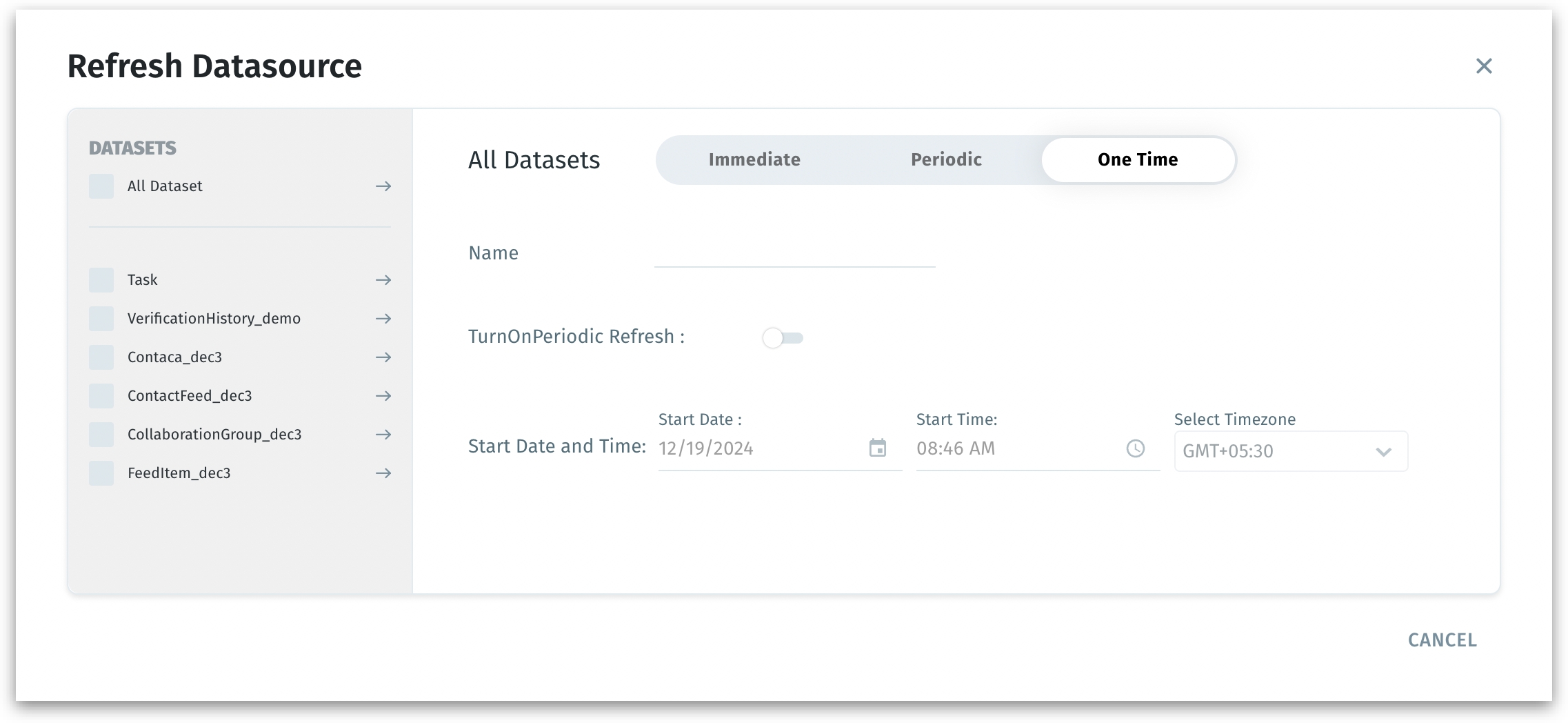 Choose the refresh method from the three available tabs: Immediate, Periodic, One-time.