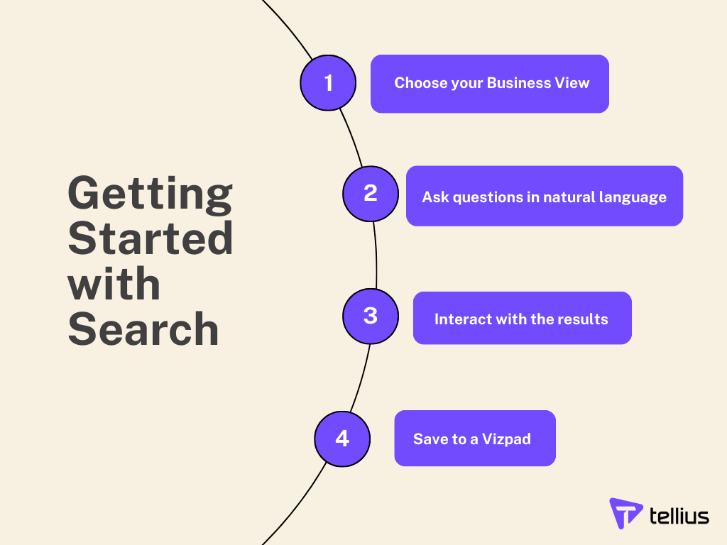 Search lets you ask natural-language questions, apply filters, compare periods, analyze trends, and drill into granular data—without SQL or dashboards.