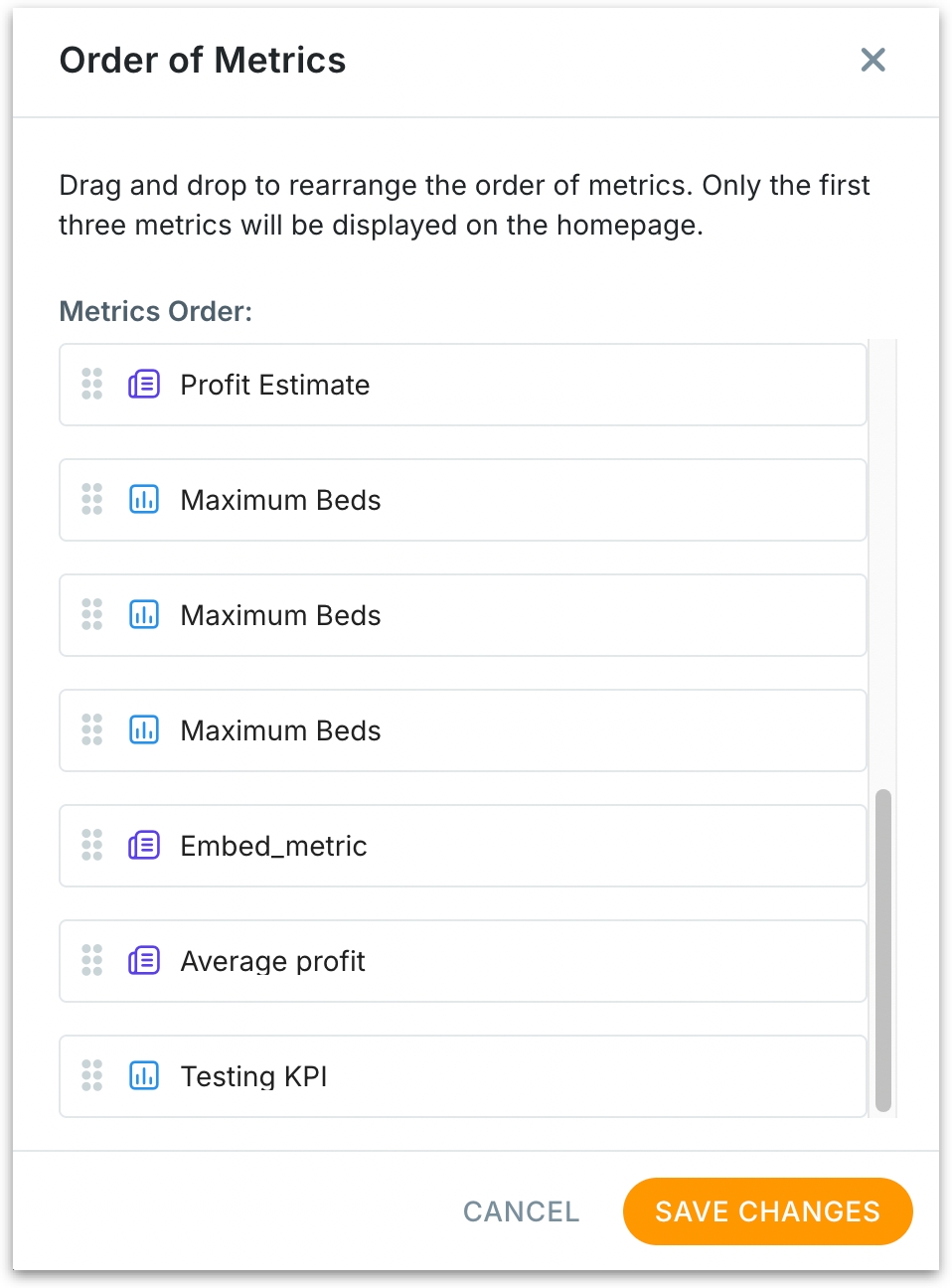 Click on the Settings icon to reorder the displayed metrics. Drag and drop the metrics as desired and click on Save Changes.