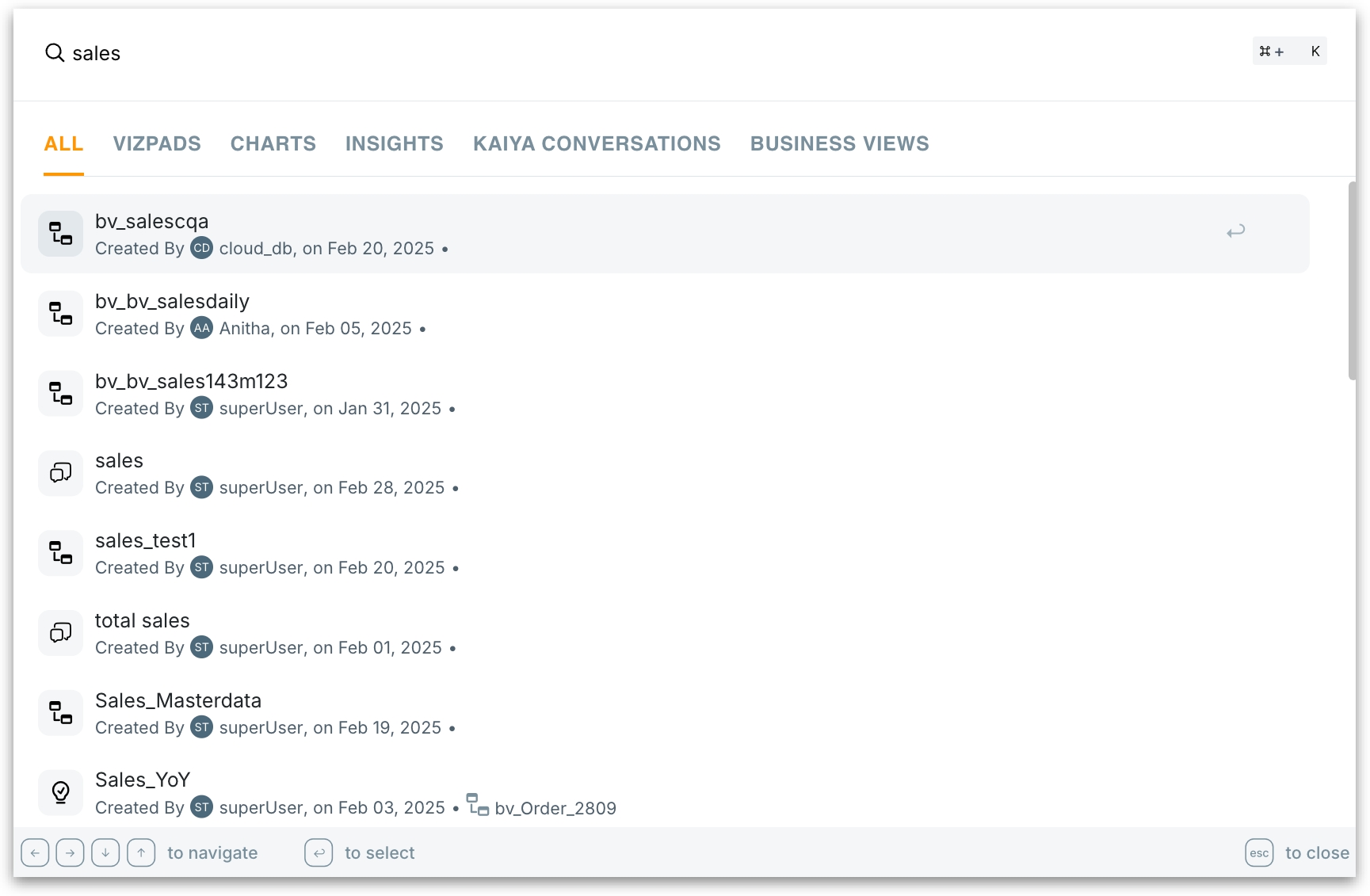 The Universal Search feature in Tellius 5.4 helps users locate and interact with resources across the platform. It is designed for fast, centralized, keyboard-driven access—letting you instantly find artifacts across Tellius with just a few keystrokes.