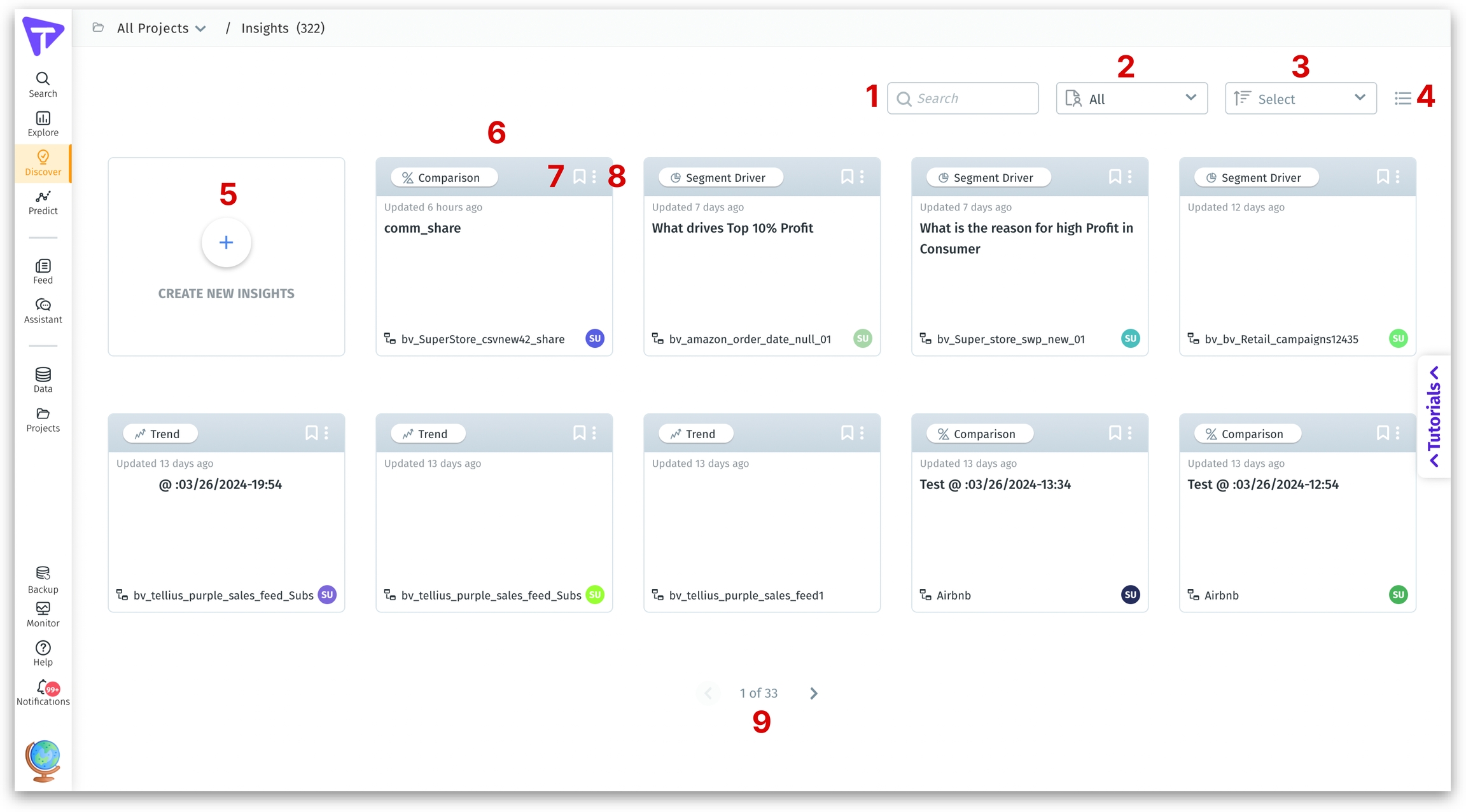 In Tellius, Insights can be accessed by clicking on the Discover tab on the left pane. All the existing Insights that were created by you or shared with you can be found here. Your journey with Insights begins with curiosity and leads to a deeper understanding of your business's data-driven narrative. Happy discovering! Let's break down the components of the following interface.
