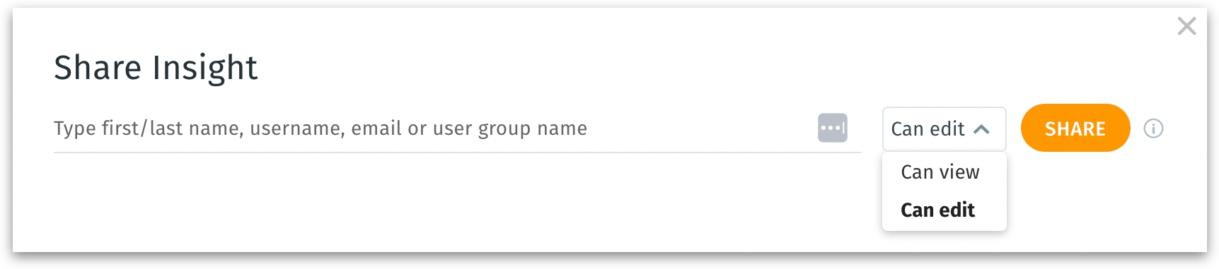 a. Share - To share the Insight with relevant permissions. The following window will be displayed where you can search for the required username, email, or user group, and provide view or edit permissions.
