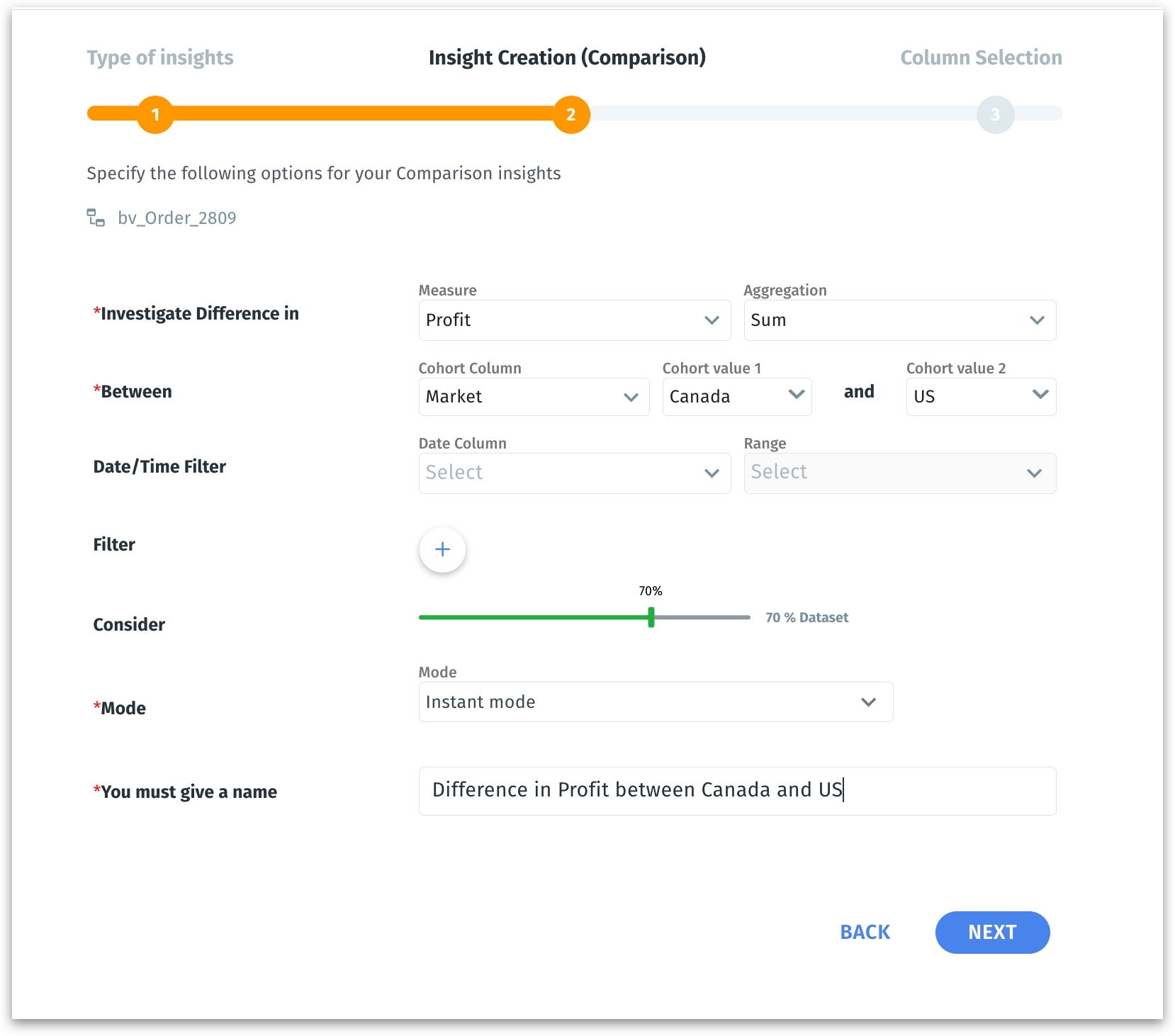 - As a first step, choose Comparison as the type of Insight you want to generate. Click on Next.