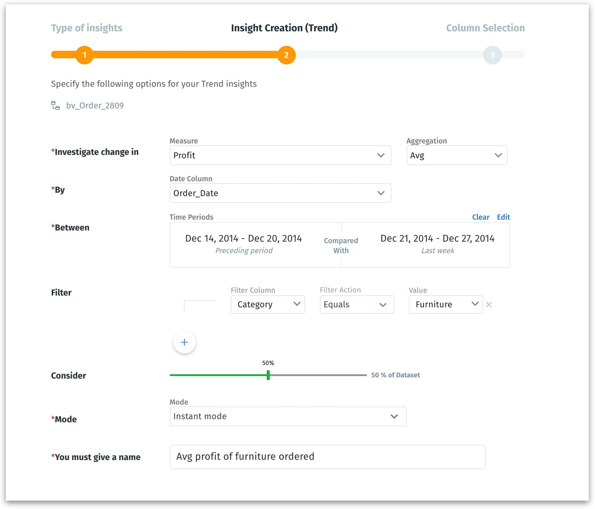- The "By" field lets you choose the dimension (e.g., "Order_Date") against which the measure will be analyzed. Specifying a dimension gives a structured context to your trend analysis, such as assessing changes day by day.