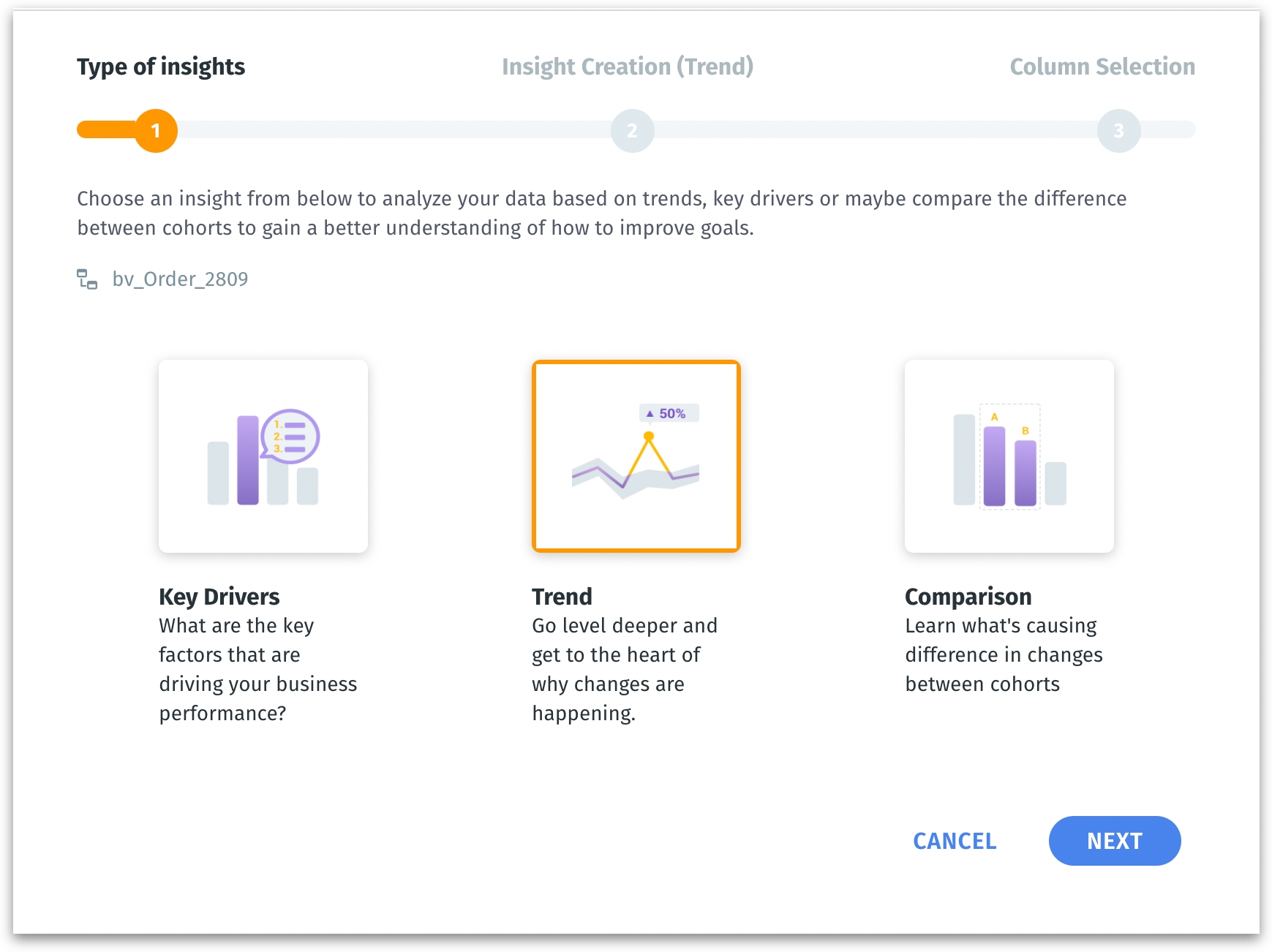 - As a first step, choose Trend as the type of Insight you want to generate. Click on Next.