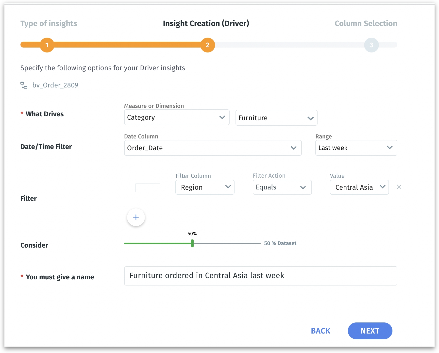 For the above configuration, the following screen will be displayed as the next step. Certain columns will be automatically excluded from the Insight generation.