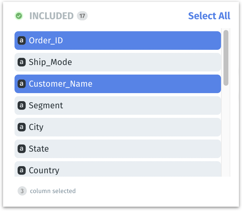 4. In the Included section, select the columns you want to exclude. As you select, you can find the number of columns selected highlighted at the bottom.