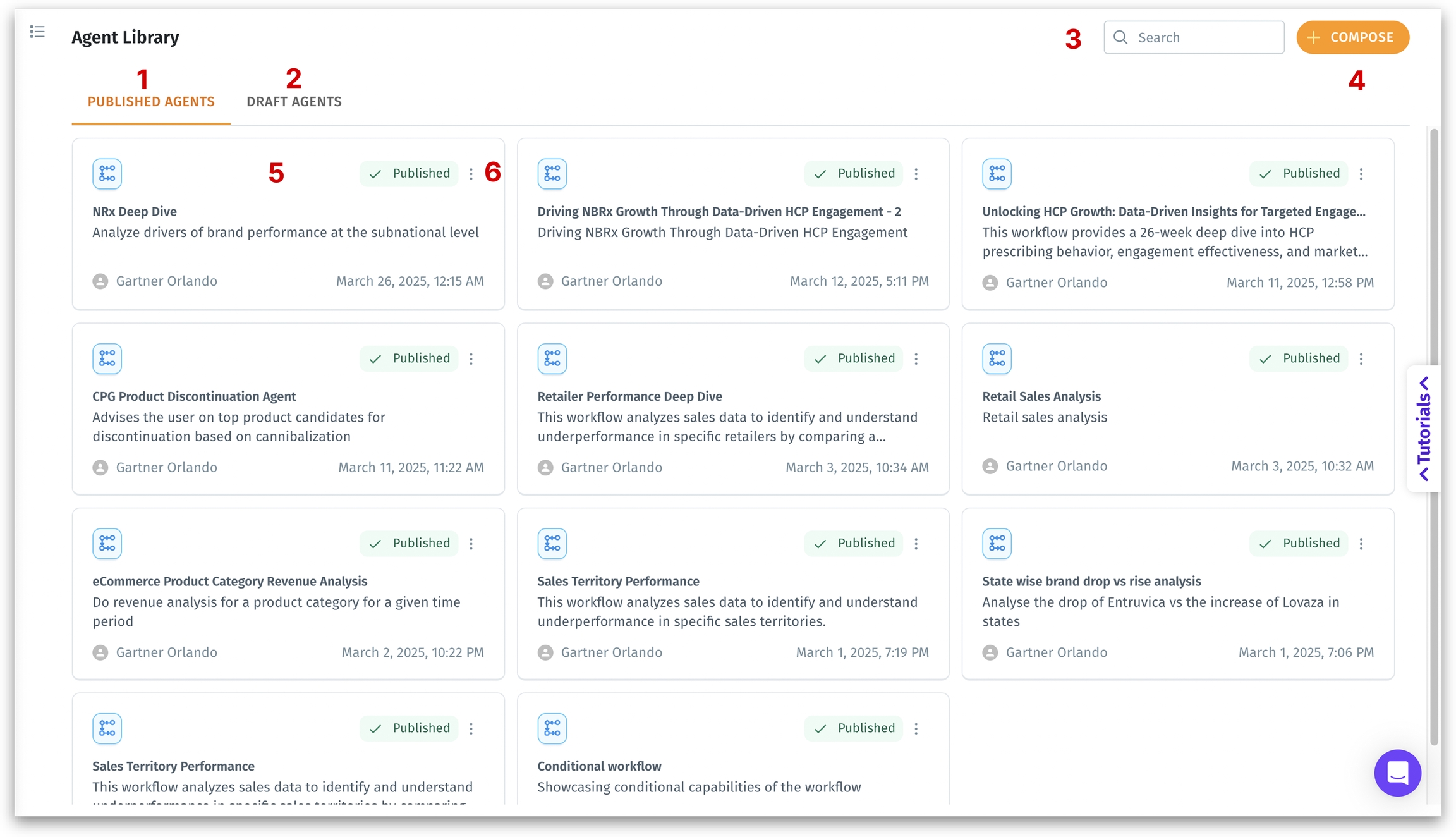 The Agent Library is the central place where users can explore, manage, and create AI-powered agentic workflows. Each agentic workflow automates and analyzes specific business questions—such as sales trends, product performance, or market behavior.
