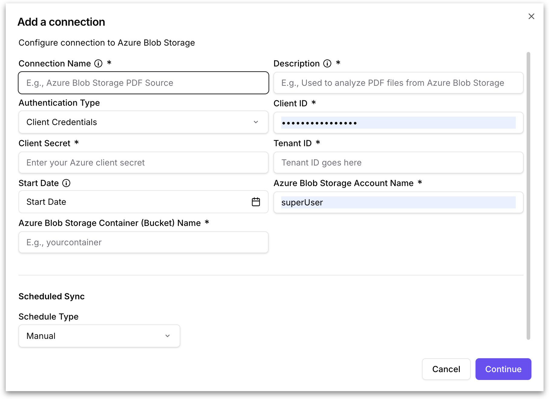 Start Date: An optional date picker that specifies the earliest date from which Tellius should pull files. Only blobs created or modified on or after this date will be synced. If left empty, Tellius syncs all files in the container.