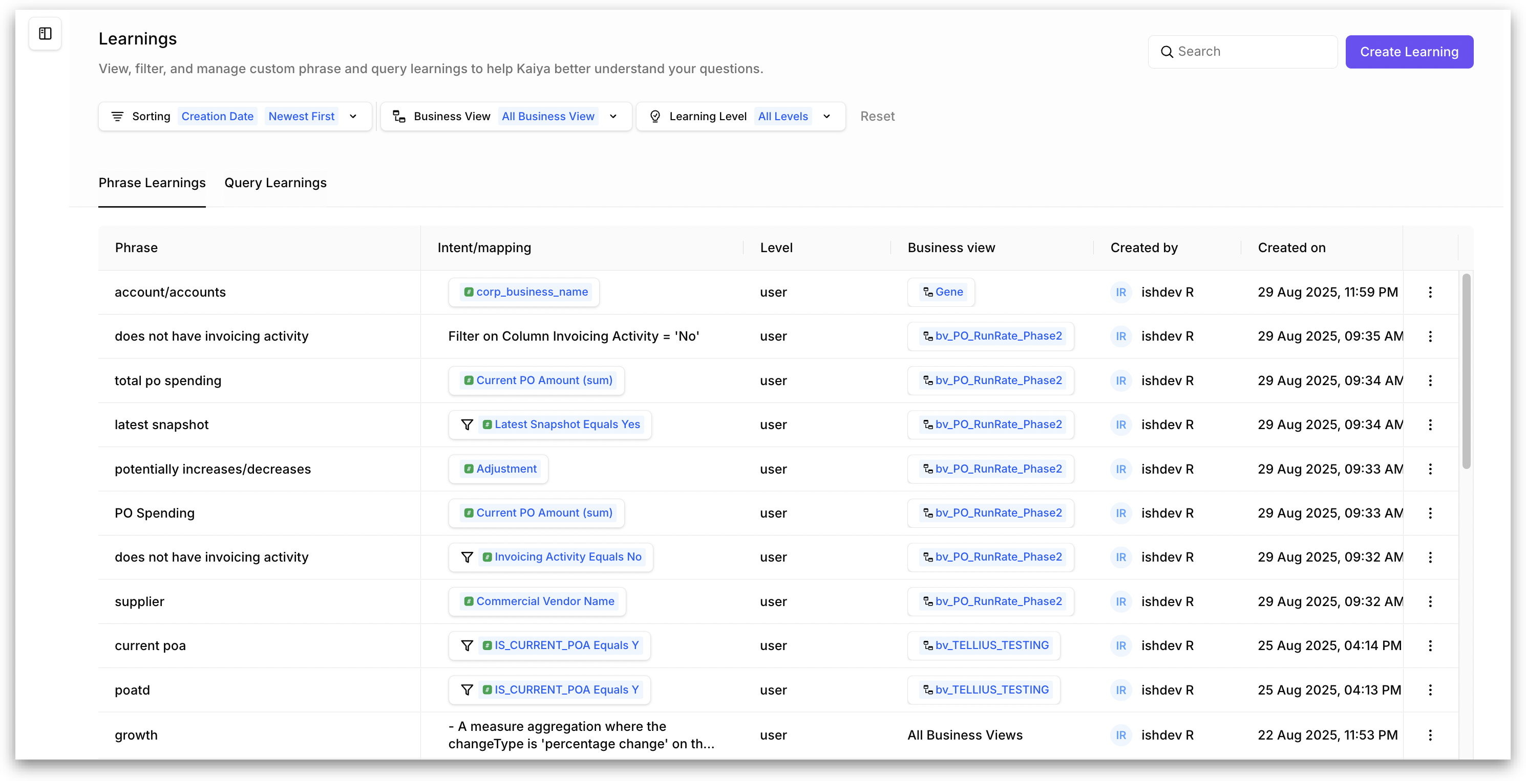 Create a **Phrase Learning** to tell Kaiya what a single word or short phrase should mean (map it to a measure, dimension, or filter condition) in a specific Business View (BV) or across All Business Views.
